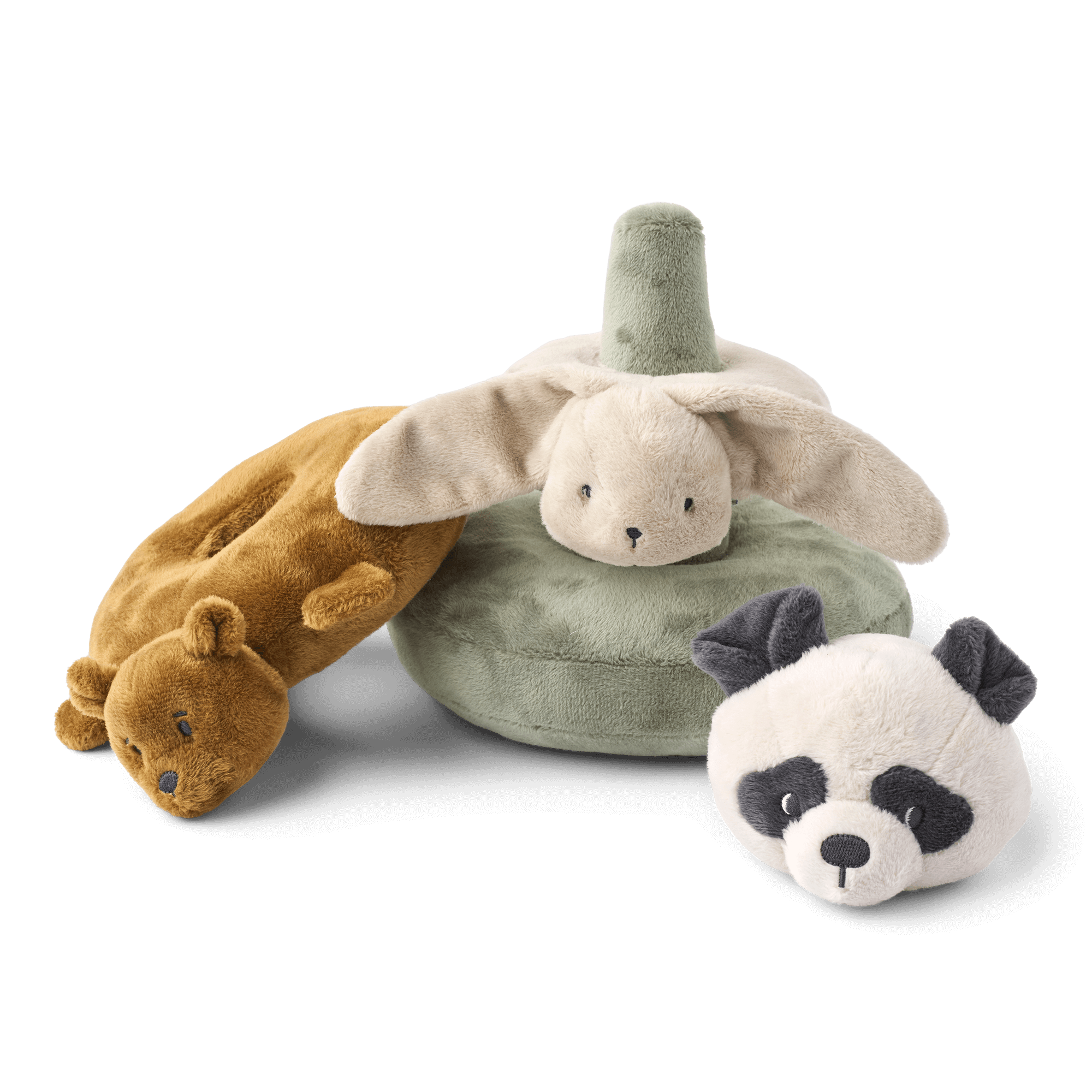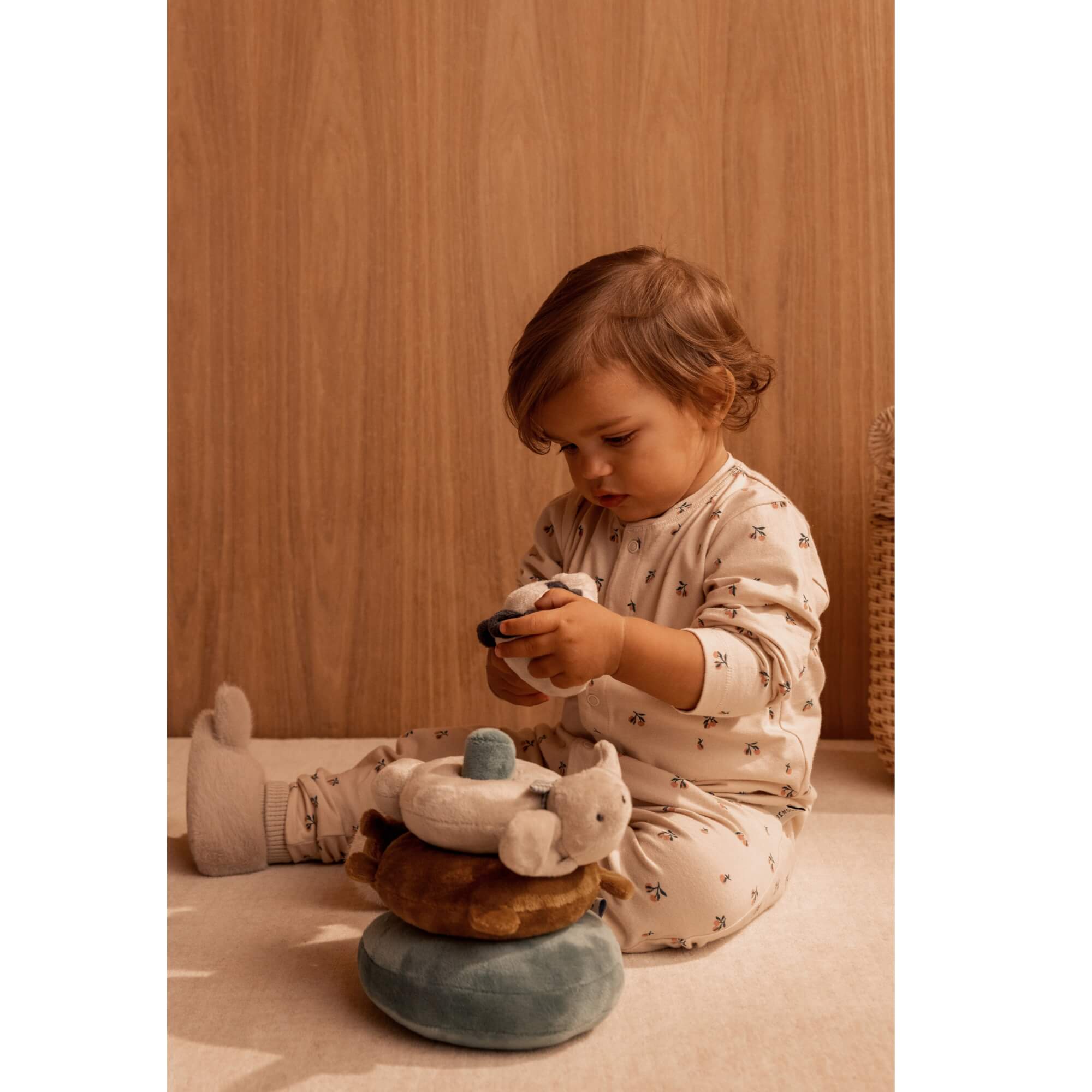 Każdy pierścień to urocze zwierzątko z szeleszczącą tkaniną i dzwoneczkami – świetna zabawka, która bawi i uczy jednocześnie. Wykonana z miękkiego, ekologicznego materiału, idealna do układania i odkrywania świata dotykiem.