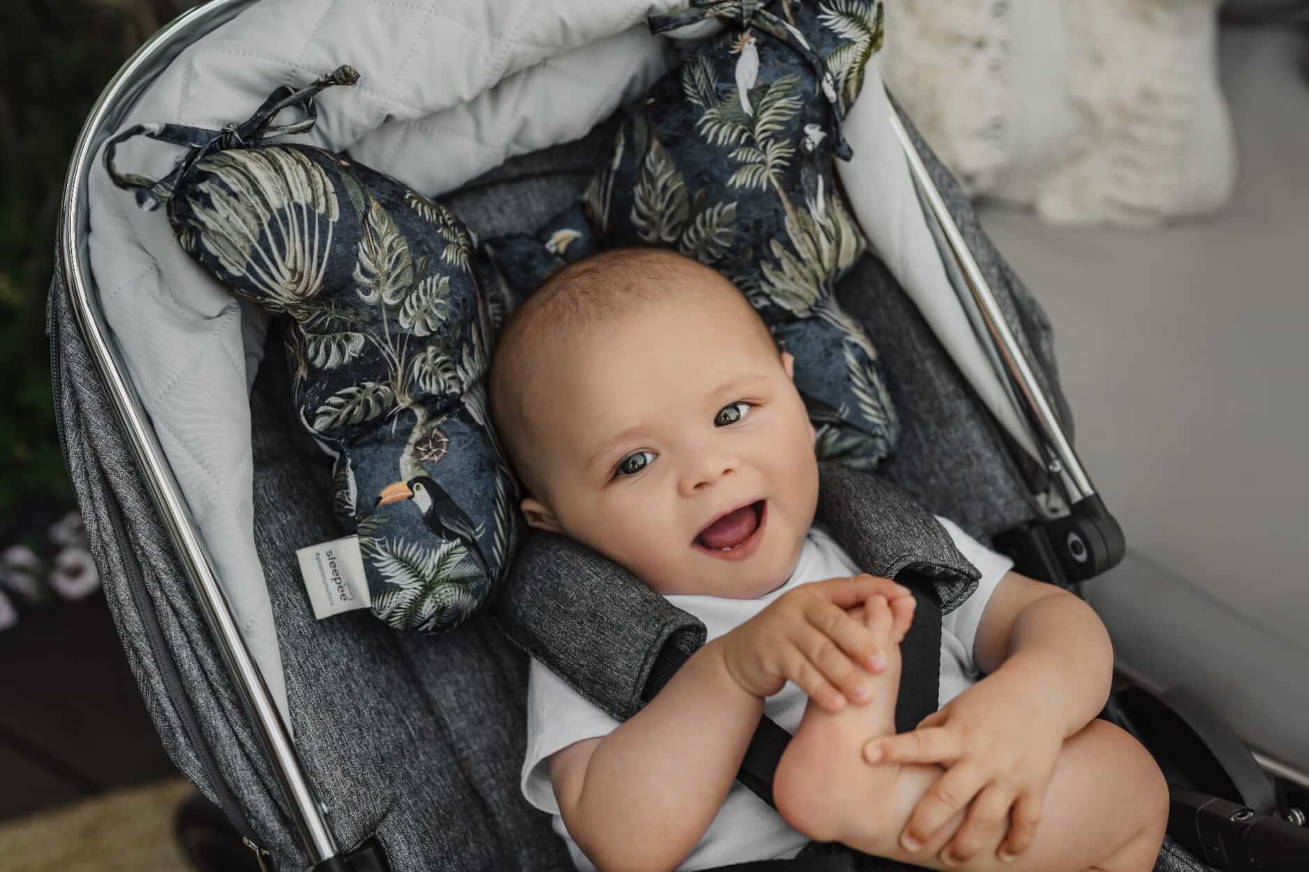 Poduszka antywstrząsowa motylek będzie rosła razem z dzieckiem – w późniejszych miesiącach można ją stosować podczas snu malucha czy używać jej w spacerówce, bujaczku lub foteliku samochodowym.