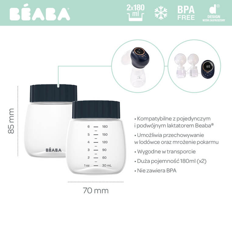 Kompatybilne z pojedynczym i podwójnym laktatorem elektrycznym francuskiej marki BEABA. Posiadają czytelne podziałki na mililitry (ml) i uncje (oz) oraz szczelne nakrętki. Idealne do zbierania, transportu i przechowywania mleka matki. Nadają się do chłodzenia i mrożenia.