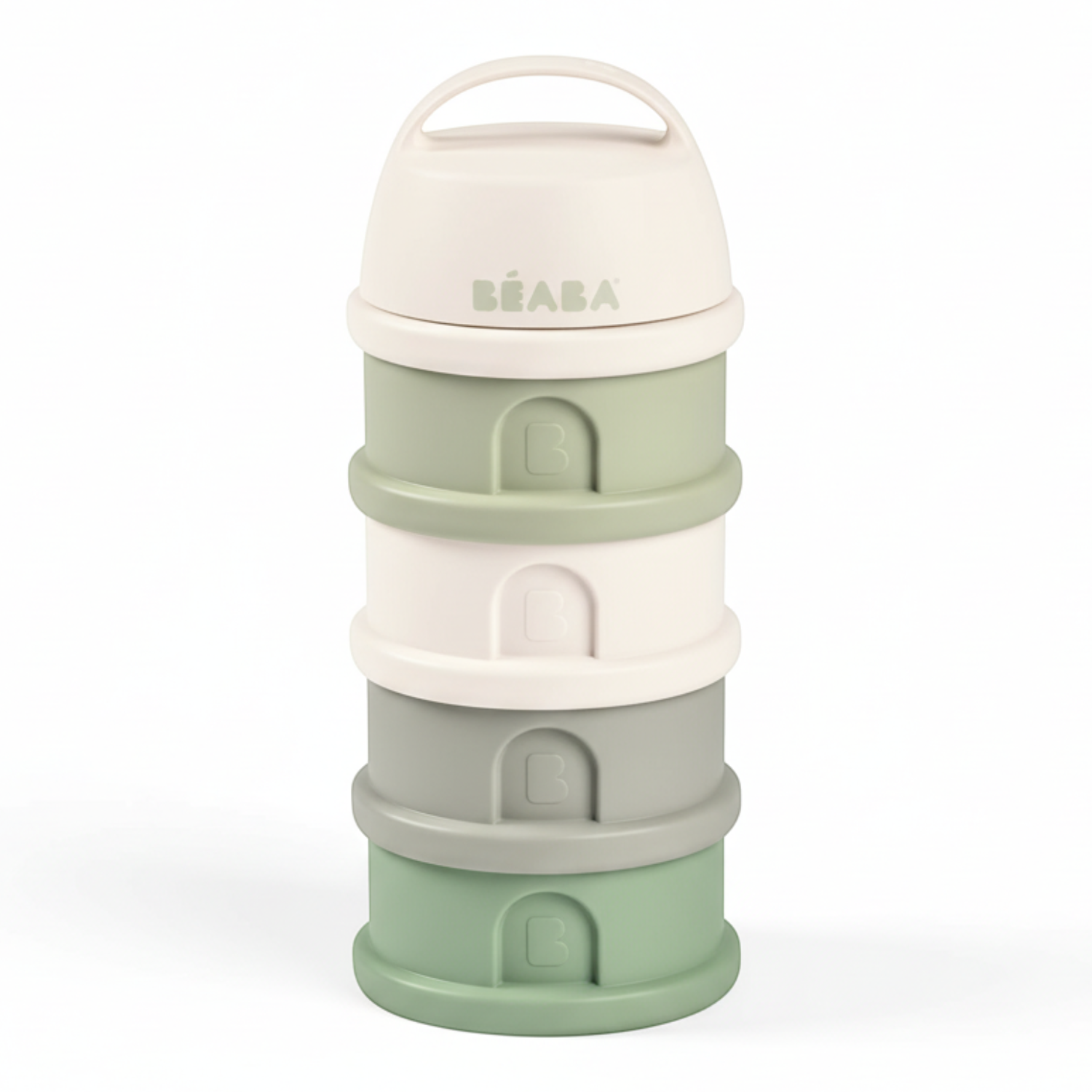 Pojemniki (szałwiowy, kremowy, jasnoszary oraz pastelowo zielony) mają pojemność w sumie 440 ml (4x110ml). Zestaw idealny do zabrania mleka w proszku na spacer, podczas podróży czy na nocne karmienia. Każda komora mieści do 11 dawek mleka w proszku. Można w nim odmierzyć porcje nawet na dobę do przodu. Pojemniczki są na tyle szerokie, że łatwo się je napełnia i czyści. Nakręca się je jeden na drugi, ale można ich także używać osobno, w zależności od potrzeb. Dodatkowa nakrętka z wąskim otworem/lejkiem ułatwia przesypanie mleka do butelki. Pokrywka jest hermetyczna oraz ma wygodny uchwyt do przenoszenia. Pojemniki z czasem mogą również służyć jako poręczne pudełka na przekąski.