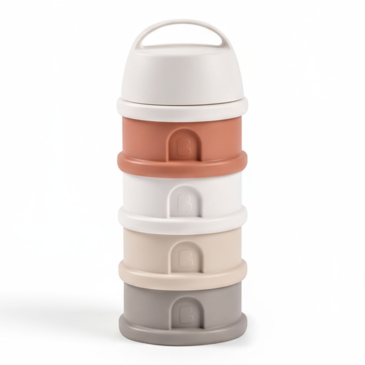 Pojemniki (ceglany, biały, kremowy i szary) mają pojemność w sumie 440 ml (4x110ml). Zestaw idealny do zabrania mleka w proszku na spacer, podczas podróży czy na nocne karmienia. Każda komora mieści do 11 dawek mleka w proszku. Można w nim odmierzyć porcje nawet na dobę do przodu. Pojemniczki są na tyle szerokie, że łatwo się je napełnia i czyści. Nakręca się je jeden na drugi, ale można ich także używać osobno, w zależności od potrzeb. Dodatkowa nakrętka z wąskim otworem/lejkiem ułatwia przesypanie mleka do butelki. Pokrywka jest hermetyczna oraz ma wygodny uchwyt do przenoszenia. Pojemniki z czasem mogą również służyć jako poręczne pudełka na przekąski.