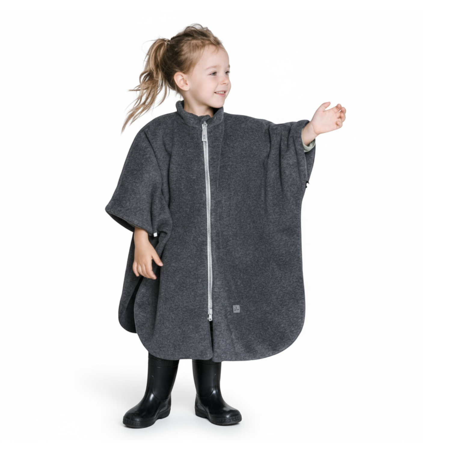 Ponczo w jednym, uniwersalnym rozmiarze, dedykowane dzieciom w wieku od 2 do 6 lat, długość zamka z przodu to 50 cm, długość całkowita poncza to około 60 cm, a rozpiętość ramion około 80 cm, więc może posłużyć bardzo długo