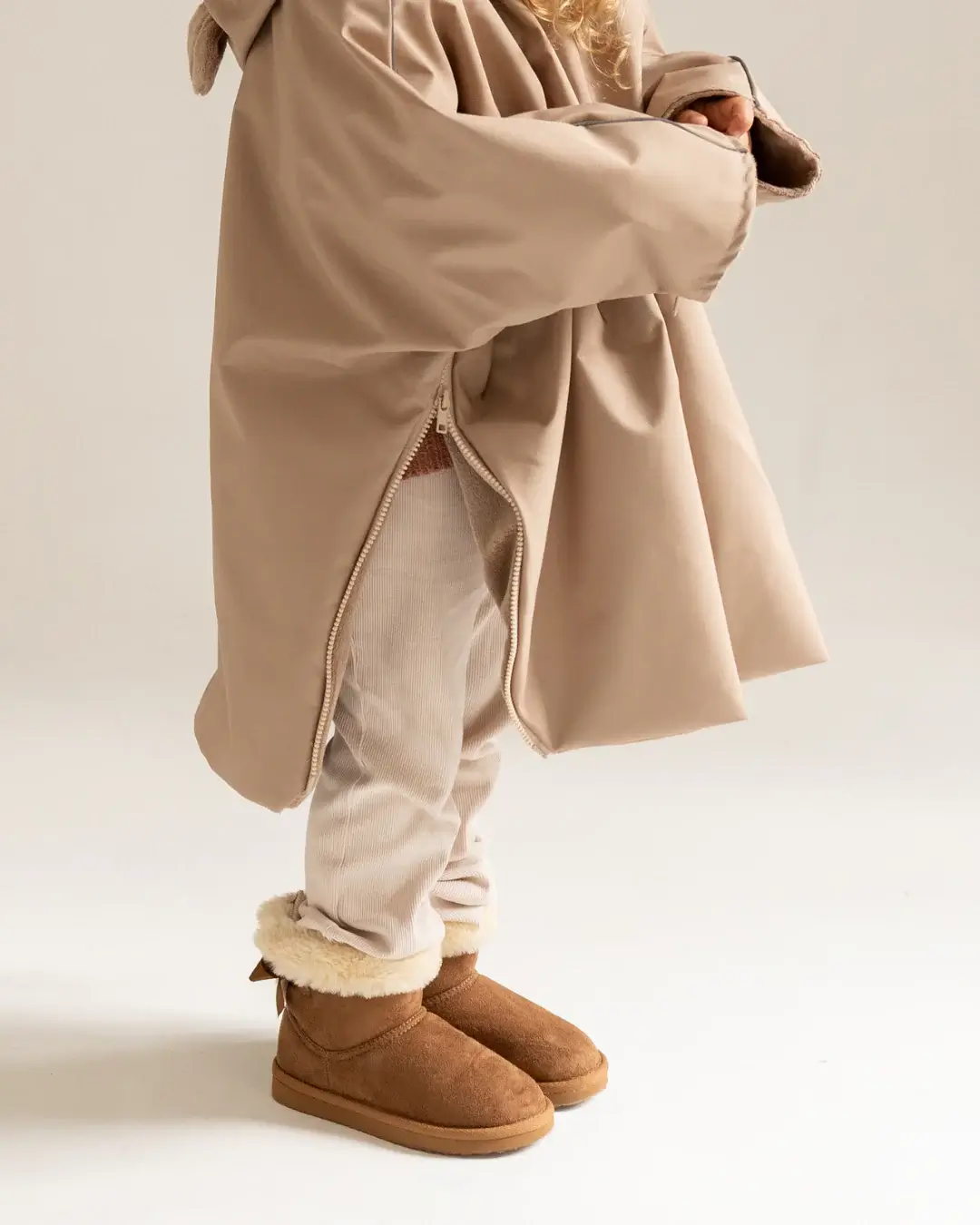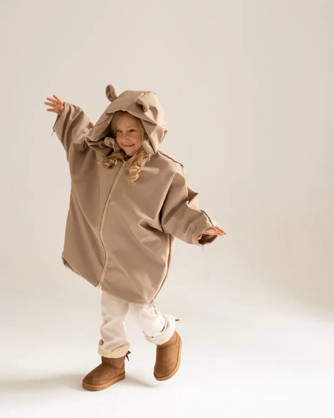 - Wodoodporna zewnętrzna warstwa, która chroni dziecko przed deszczem, śniegiem, wiatrem. Środek poncza wykonany z miękkiego i ciepłego futerka.