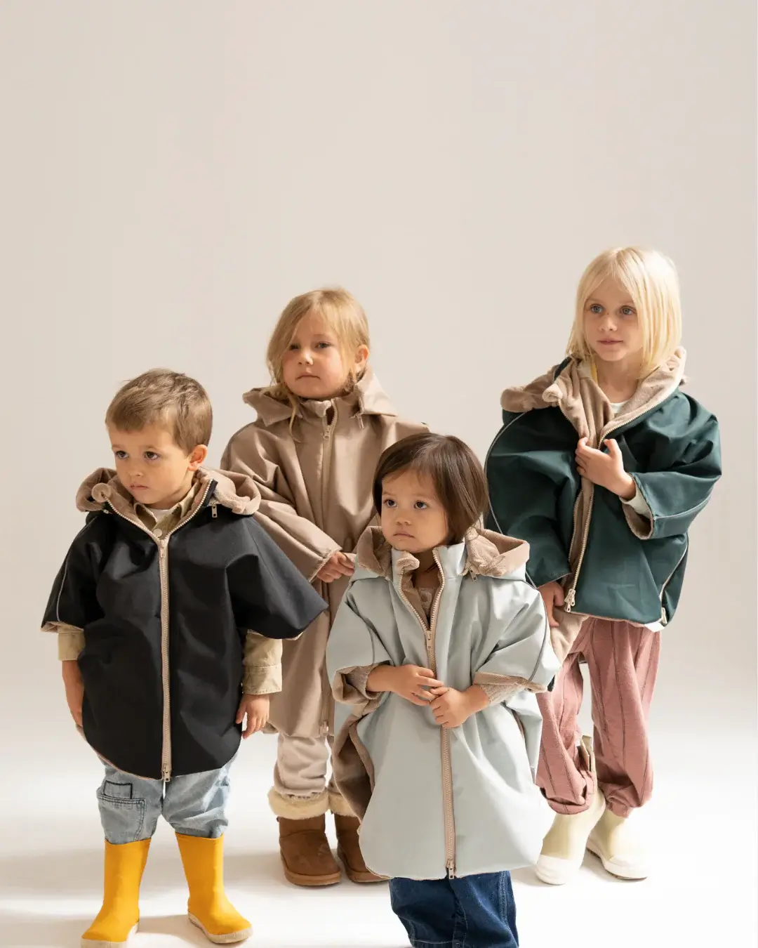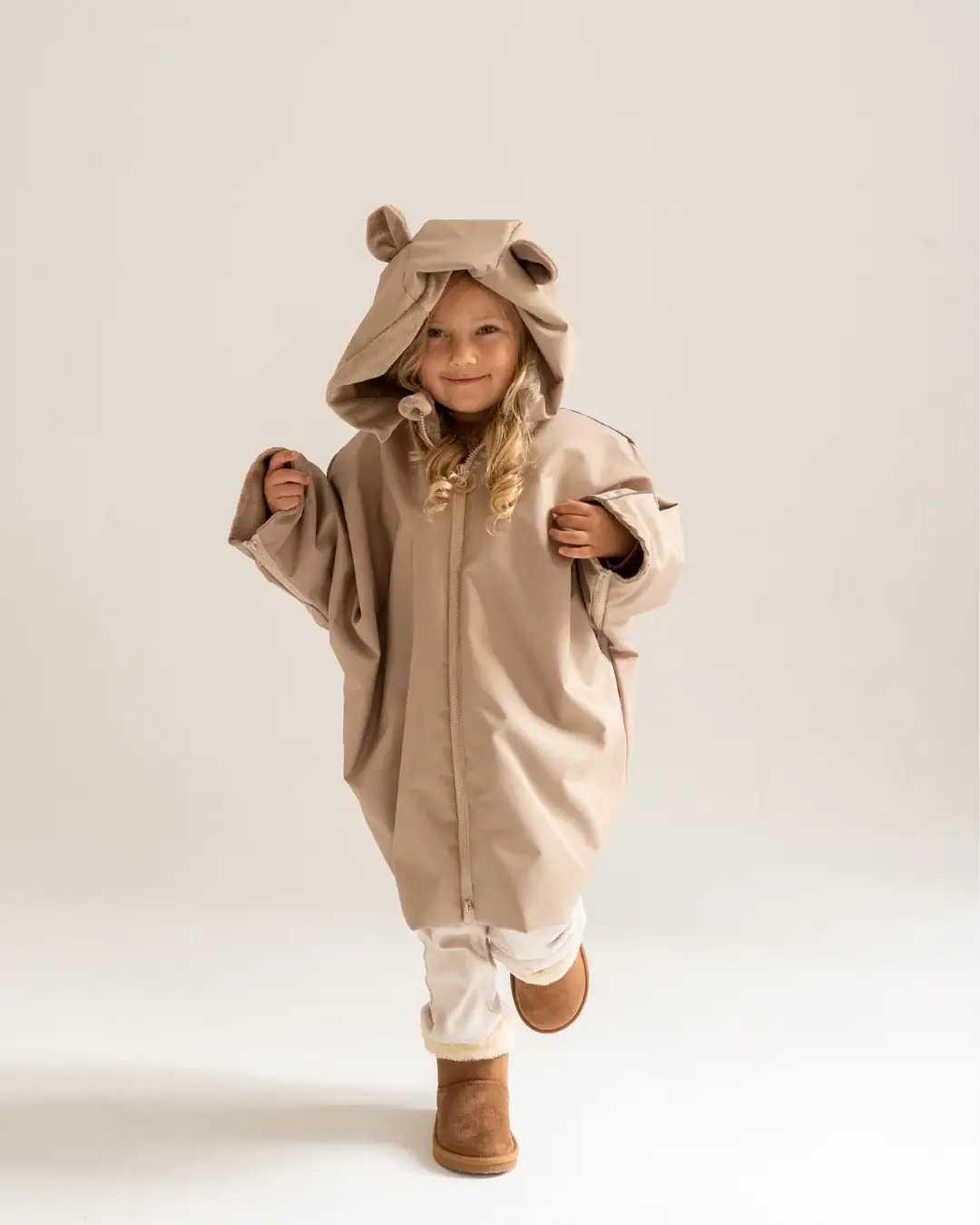 - Ponczo idealnie po zapięciu zamków bocznych stanie się wiatroszczelną kurtką przy zabawach na zewnątrz, podczas jazdy na rowerze, na hulajnodze oraz przy jesiennych spacerach.