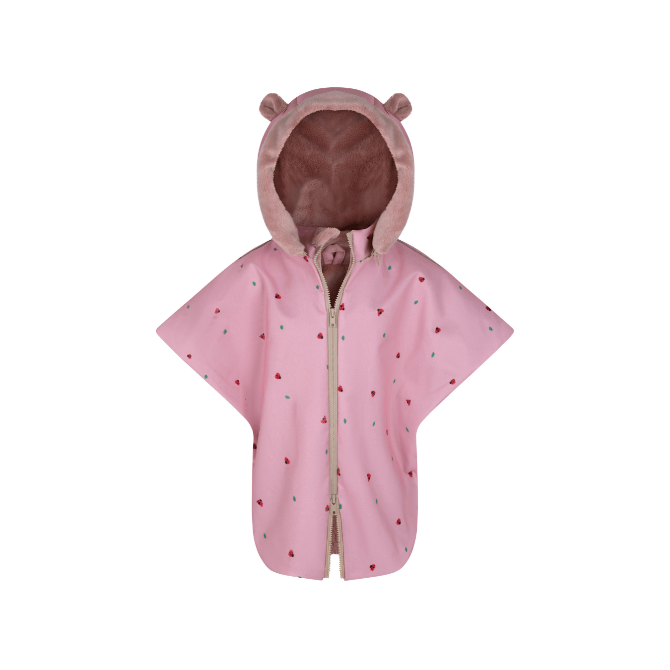 - Wodoodporna zewnętrzna warstwa, która chroni dziecko przed deszczem, śniegiem, wiatrem. Środek poncza wykonany z miękkiego i ciepłego futerka.