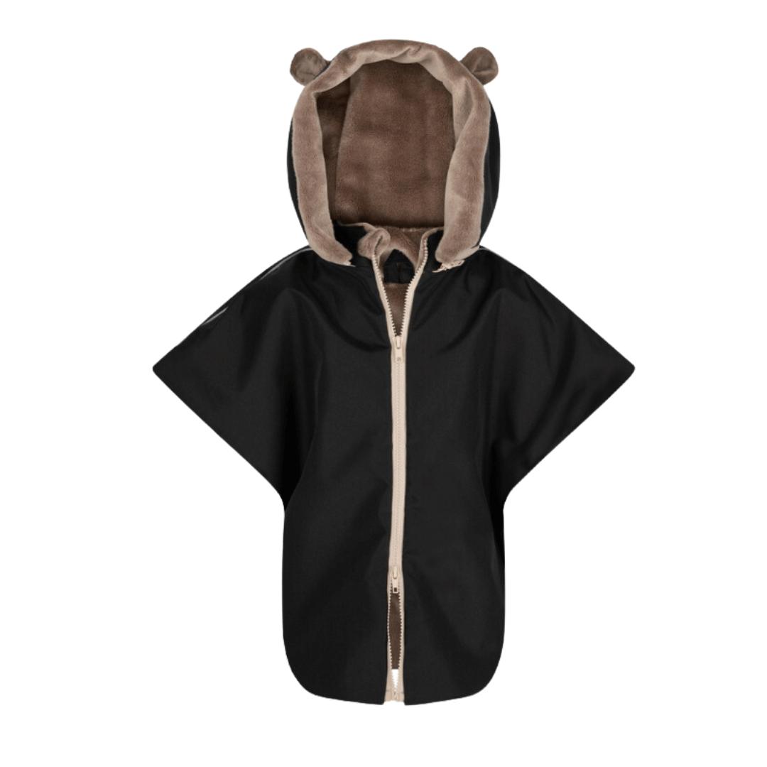 - Wodoodporna zewnętrzna warstwa, która chroni dziecko przed deszczem, śniegiem, wiatrem. Środek poncza wykonany z miękkiego i ciepłego futerka.