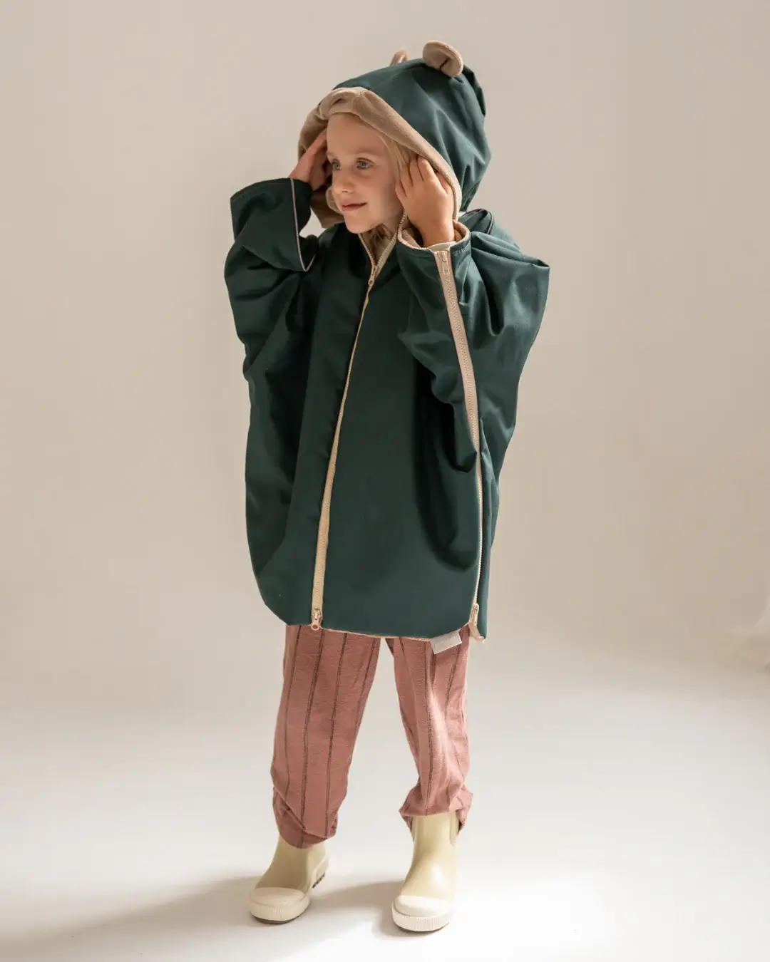 - Ponczo idealnie po zapięciu zamków bocznych stanie się wiatroszczelną kurtką przy zabawach na zewnątrz, podczas jazdy na rowerze, na hulajnodze oraz przy jesiennych spacerach.