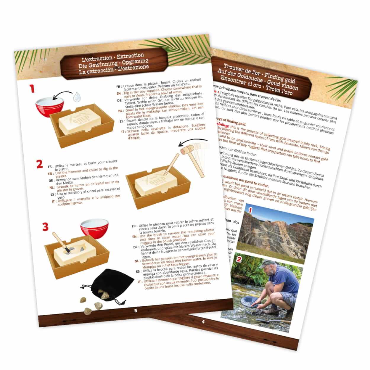 Dwie techniki poszukiwania złota do odkrycia: płukanie w celu oddzielenia złota od piasku i wydobycie w celu wykopania bryłek tzw. "złota głupców" (pirytu)