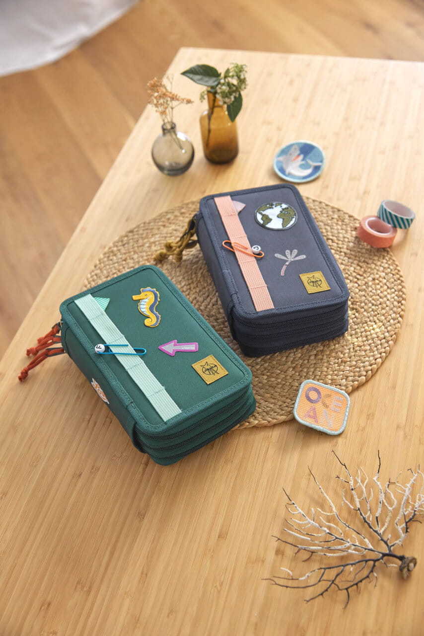 Ładny i praktyczny trzy poziomowy piórnik z wyposażeniem niemieckiej marki LASSIG