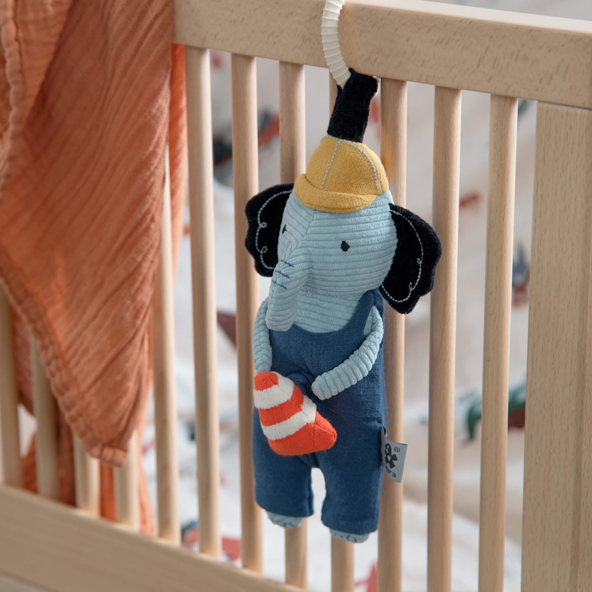 Ma żebrowany pierścień C na górze czapki, dzięki czemu można ją łatwo przymocować do stojaka z zabawkami, fotelika samochodowego lub wózka. Jeśli pociągniesz za stożek za brzuszek słonia, Ty i Twoje dziecko możecie cieszyć się dźwiękami kojącej kołysanki Brahmsa.