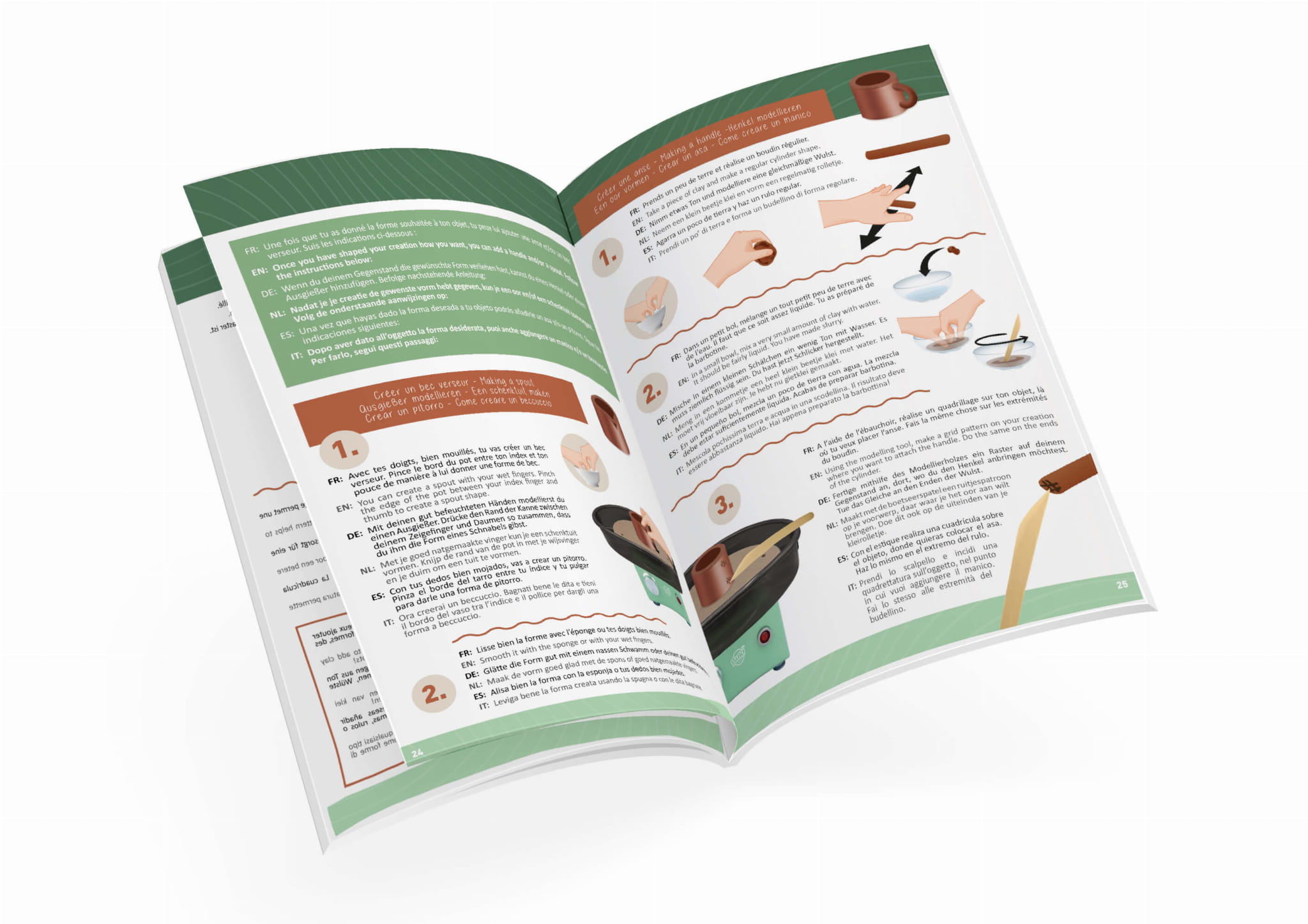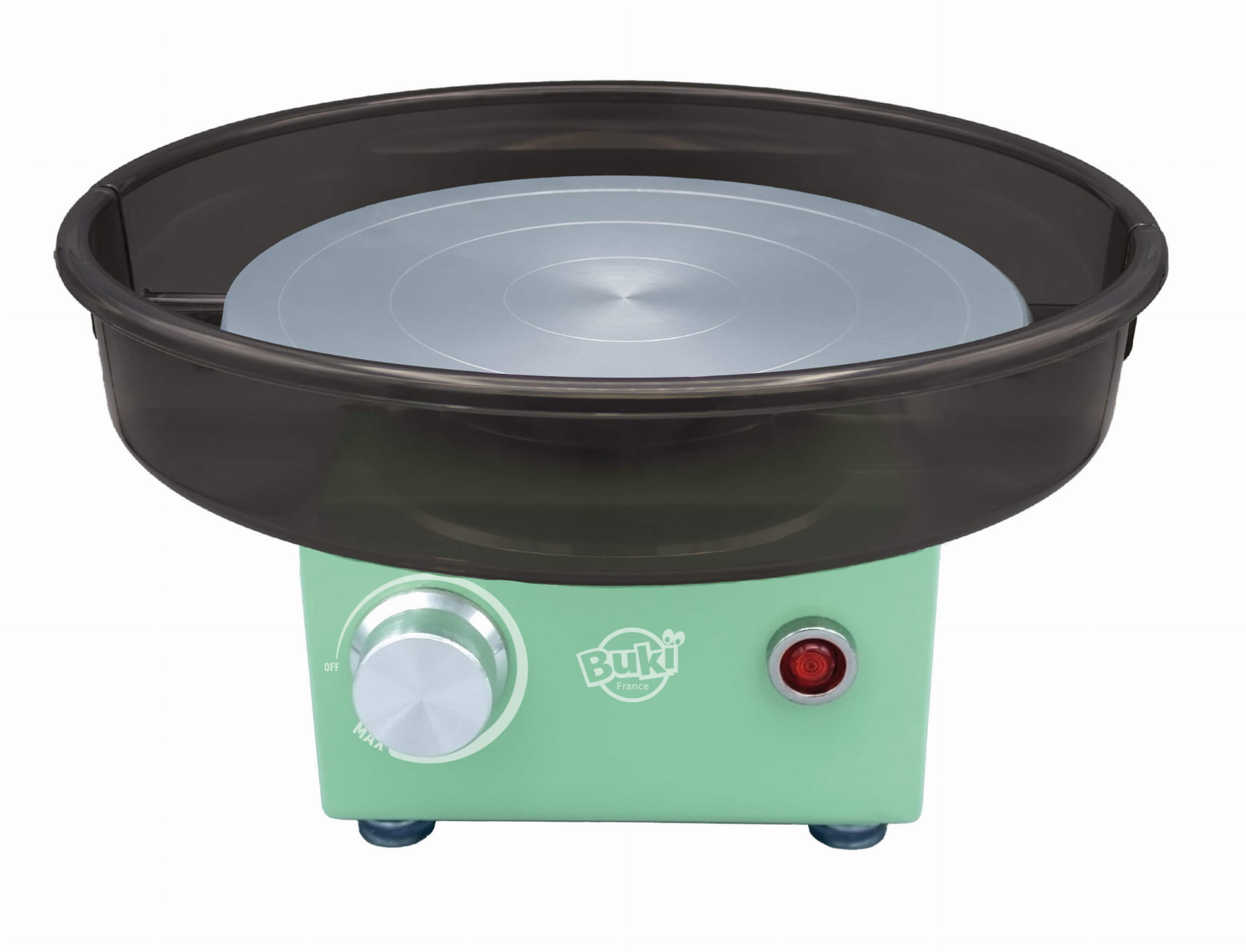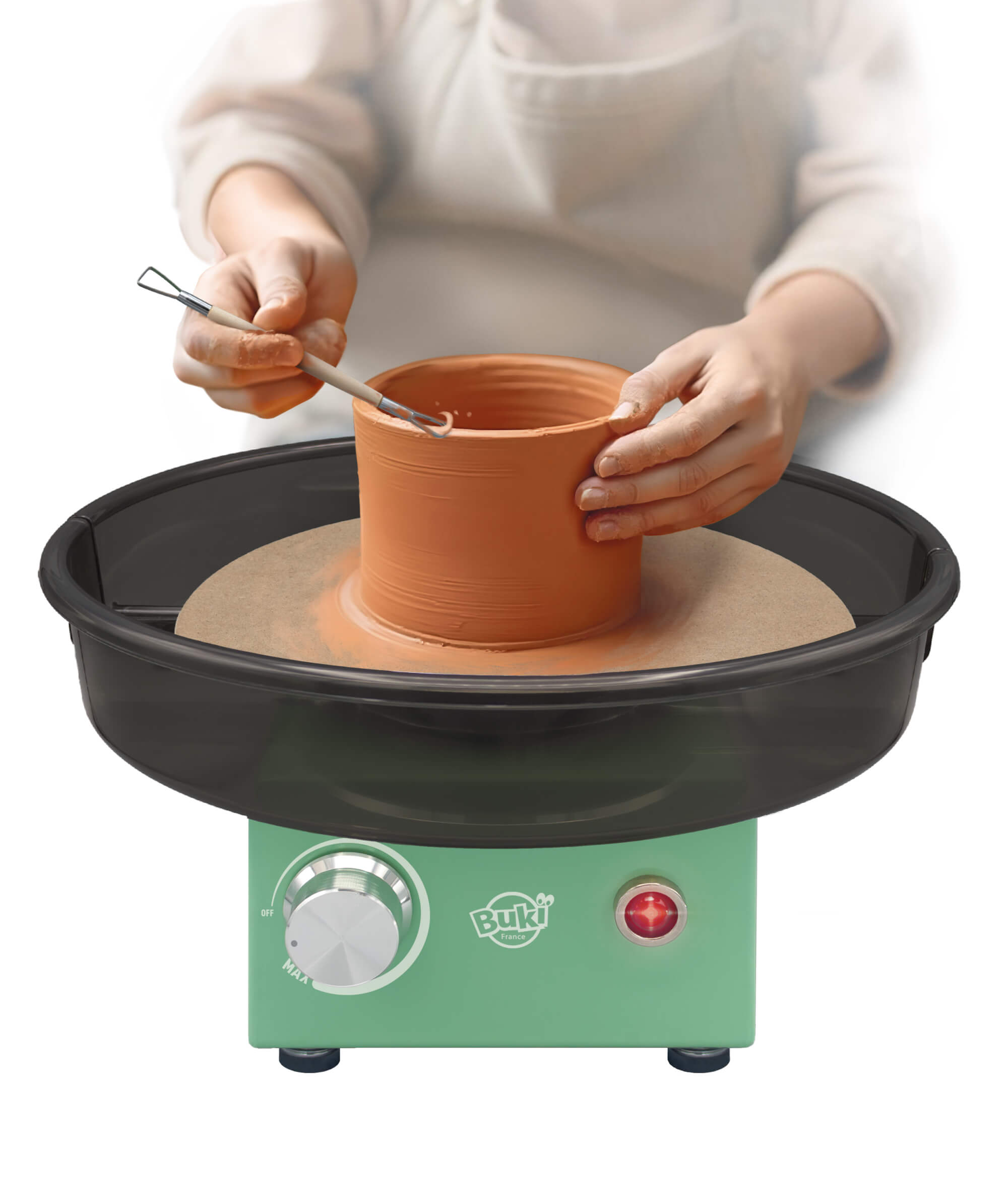 W zestawie znajdują się wszystkie niezbędne akcesoria. Koło garncarskie działa wyłącznie z dołączonym zasilaczem sieciowym, który zapewnia zasilanie 12 V.