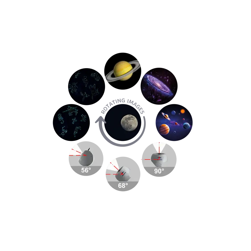 Ten czarujący projektor zamienia ściany i sufit w urzekający pokaz świetlny dzięki sześciu wymiennym dyskom. Dzięki ilustrowanej edukacyjnej książeczce pobudza ciekawość, jednocześnie wyciszając przed snem. To zaproszenie do spokoju, marzeń i odkrywania… na noce pełne słodkich snów.