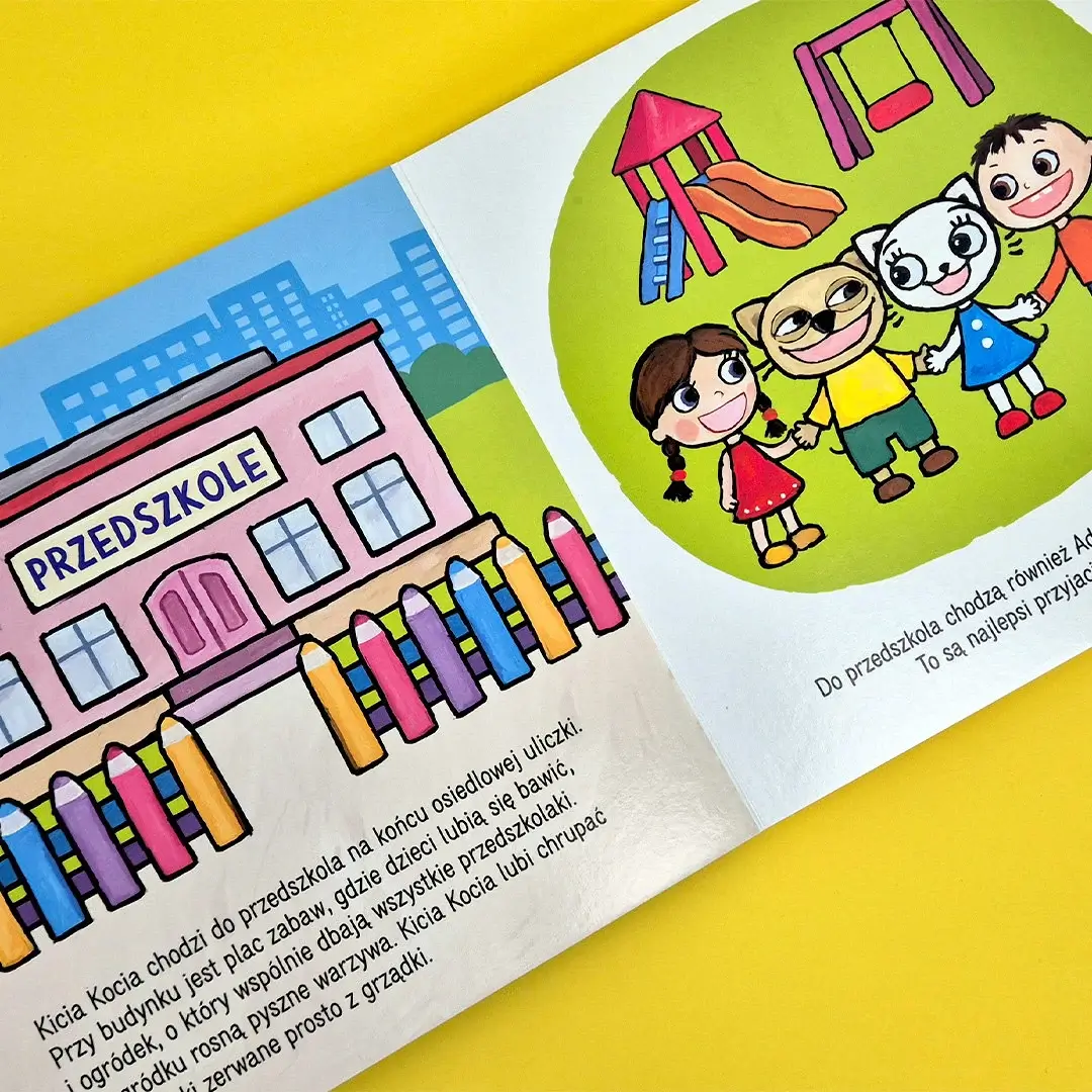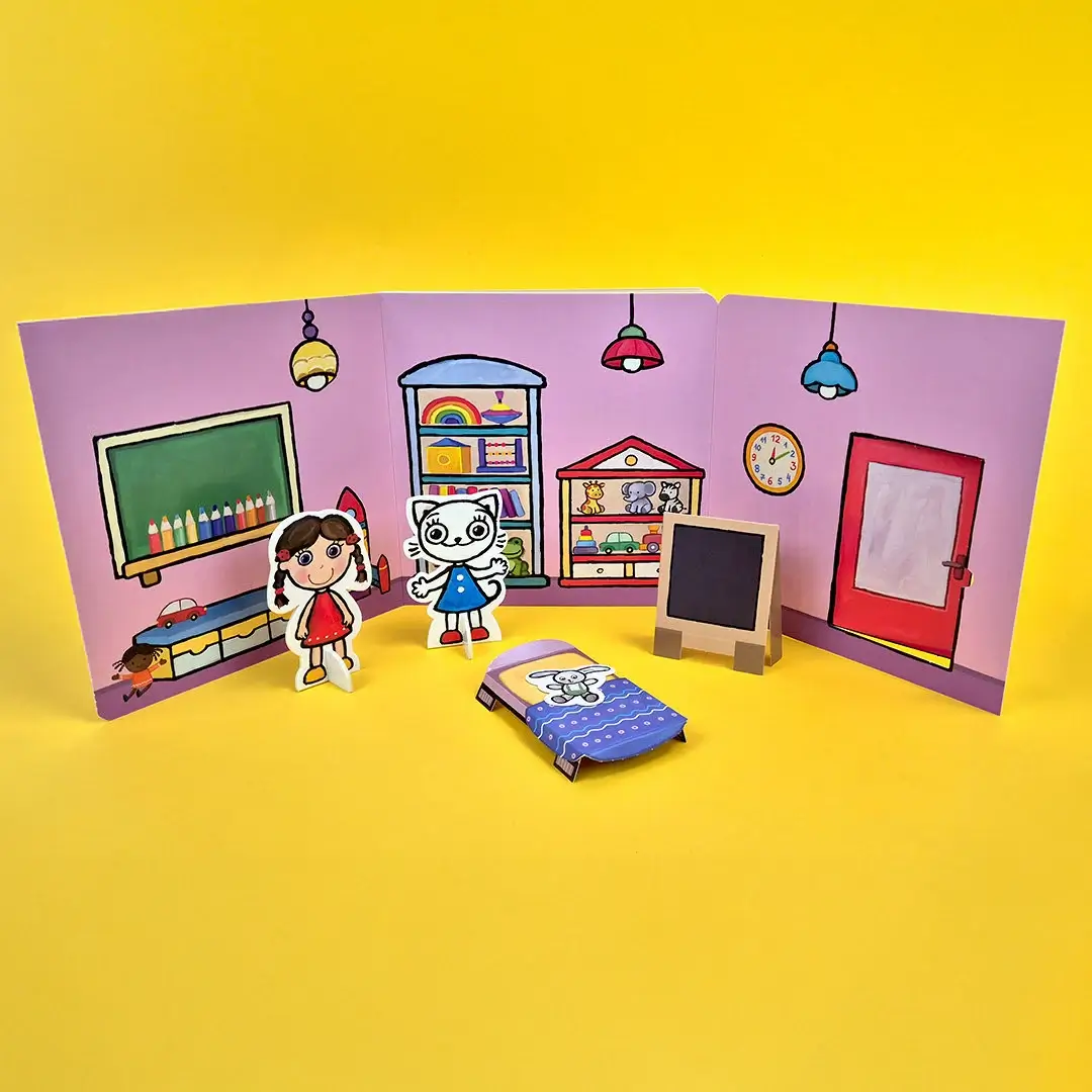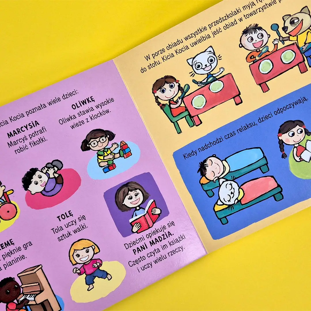 Przeczytaj historyjkę, przemień książkę w prawdziwe przedszkole, ustaw mebelki i baw się tekturowymi figurkami. Do zabawy możesz wykorzystać także mebelki i figurki z poprzedniej książeczki z tej serii „Domek Kici Koci”.