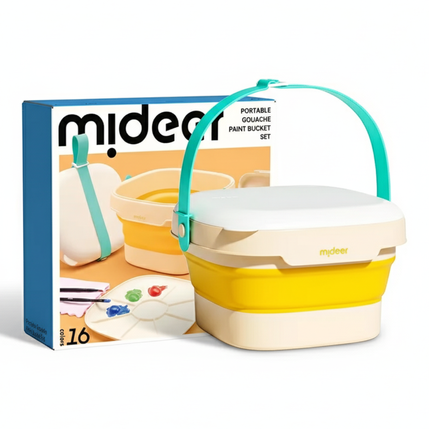 To wygodny, przenośny zestaw, który zawiera w sobie wszystko, co jest potrzebne do rozpoczęcia nowego dzieła. Po wyjęciu farbek do wiaderka możecie nalać wody, a z wieczka zrobić paletę malarską. Po zakończeniu malowania, spakujcie wszystko z powrotem i ruszcie w dalszą drogę!