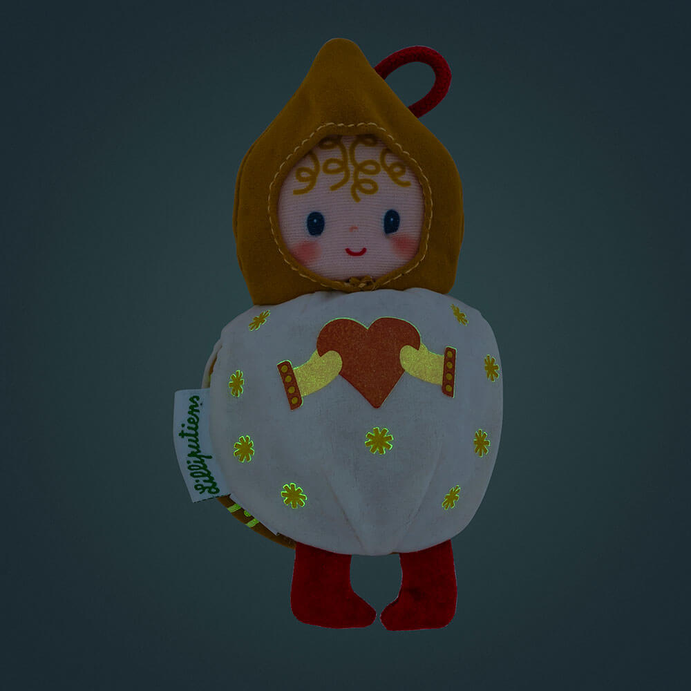 Dwustronna przytulanka świąteczny elf-choinka marki Lilliputiens to idealny przyjaciel dla maluszka. Przytulanka jest miękka, poręczna i doskonały do tulenia, uspokajania czy usypiania. Ma postać uroczego elfa w żółtym kapturku, a po wywróceniu na drugą stronę zamienia się w bombkę. Zarówno gwiazdki na białym ubranku elfa, jak i wzorki na bombce dodatkowo świecą w ciemności, co dodaje jej świątecznego uroku.