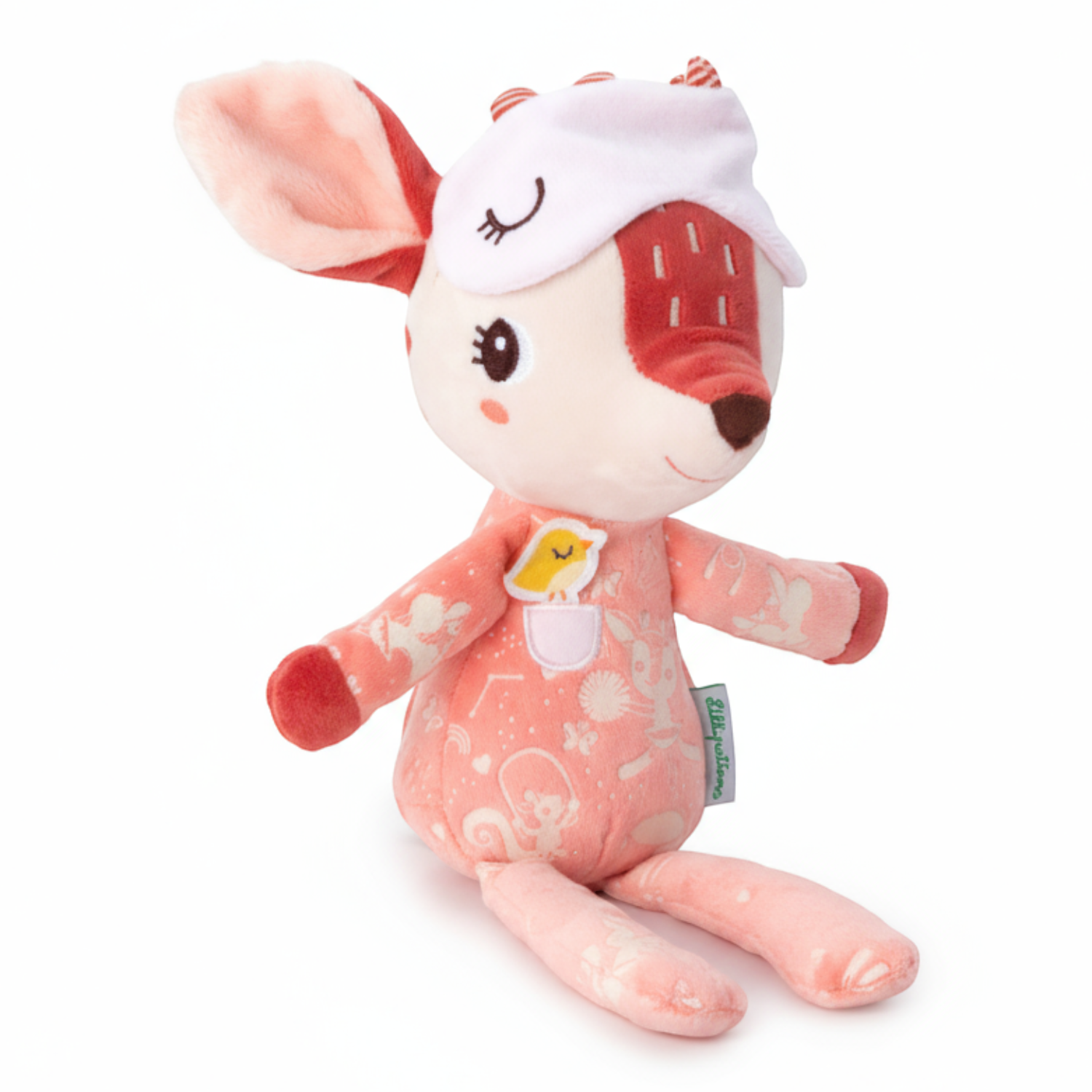 To wspaniały pierwszy przyjaciel maluszka. Jest idealny do tulenia, uspokajania i usypiania. Ma postać ceglano-różowej sarenki o imieniu Stella, 32 cm wysokości i różową piżamkę z kieszonką (i ptaszkiem-naszywką, która dodatkowo stymuluje sensorycznie) oraz z fluorescencyjnymi grafikami, które świecą w ciemności. Stella ma pasiaste różki i sterczące uszy, a na głowie opaskę, którą można zsuwać na oczy. Opaska ta także świeci po zgaszeniu światła. Przytulanka jest solidnie wykonana i bezpieczny. Aktywizuje zmysł dotyku i wzroku, pomaga w zasypianiu i wyciszaniu się.
