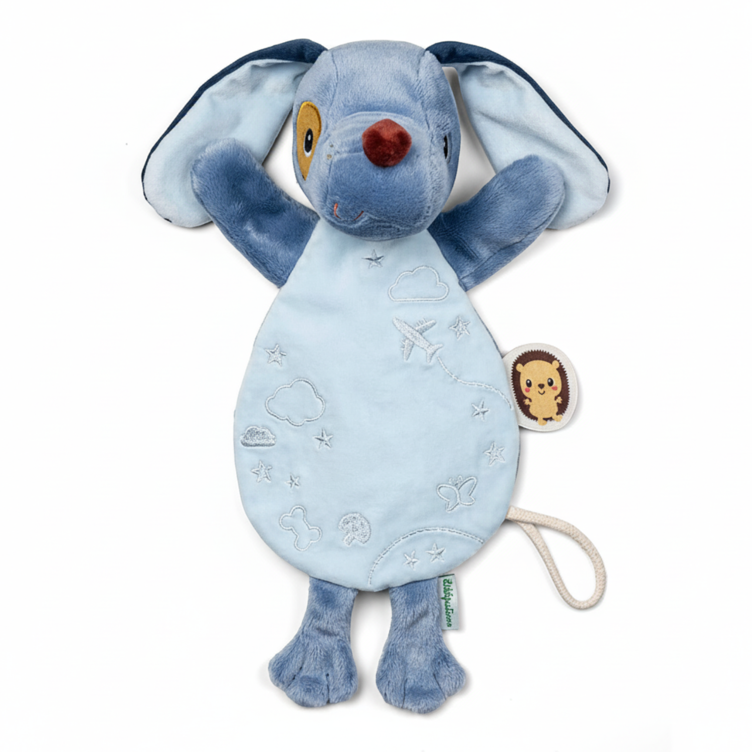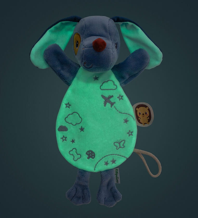Jest idealna do tulenia, uspokajania i usypiania. Ma postać niebieskiego pieska z długimi uszami, sznurkową zawieszką do której można przymocować smoczek oraz z fluorescencyjnymi uszkami i brzuszkiem (świecą w ciemności). Przytulanka jest płaska, więc może pełnić funkcję komfortera, a dzięki otworowi w brzuszku – także pacynki, którą można poruszać i „ożywiać”. Jest solidnie wykonana i bezpieczna. Aktywizuje zmysł dotyku i wzroku, pobudza wyobraźnię, pomaga w zasypianiu i wyciszaniu się.