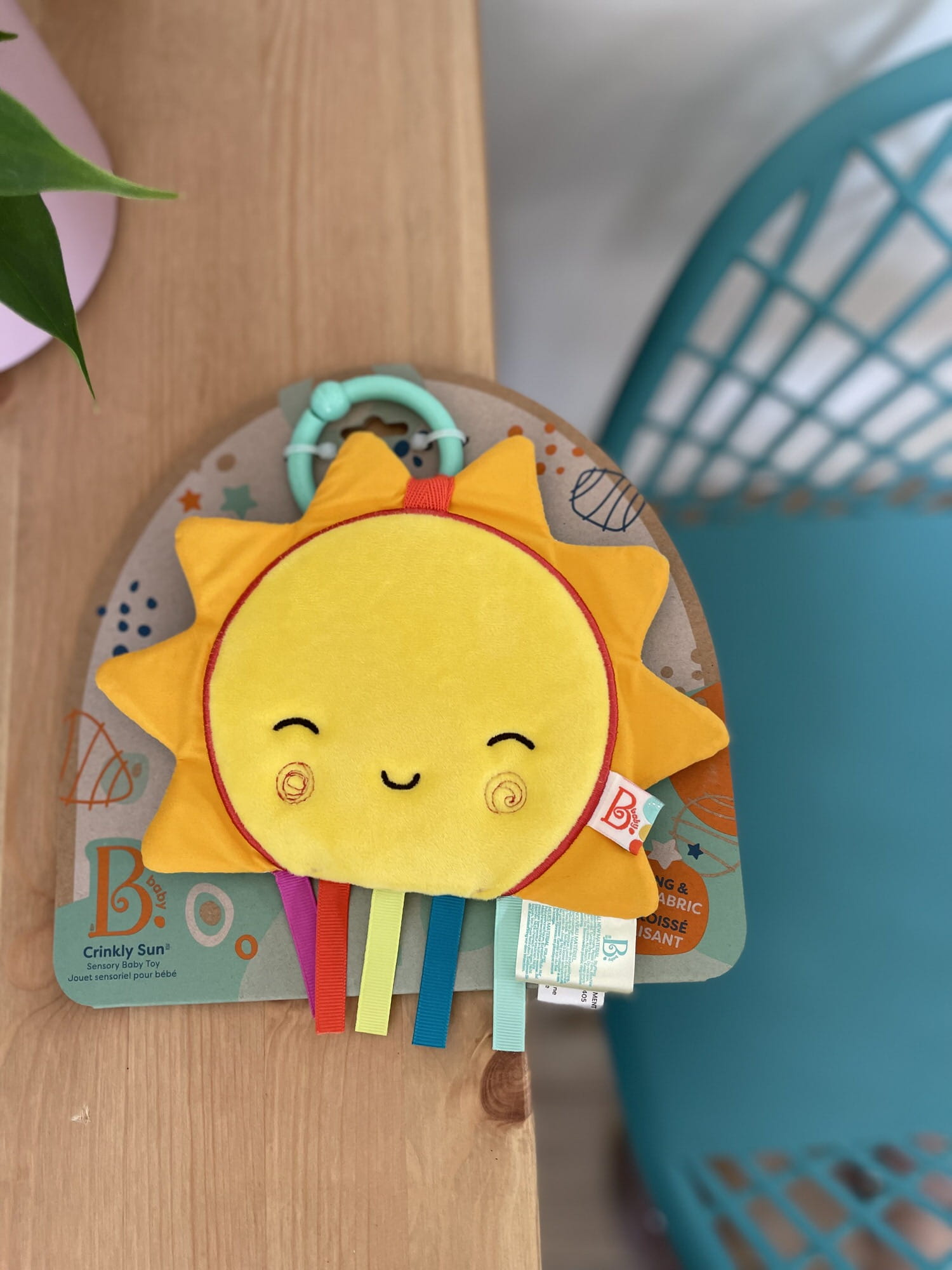 Kolorowe tasiemki stymulują chwyt, co przyczynia się do budowania koordynacji ruchowo-wzrokowej. Rewers pokryty wzorem w urocze wielobarwne grochy. Wygodny pierścień umożliwia przypięcie słoneczka do łóżeczka czy wózka.