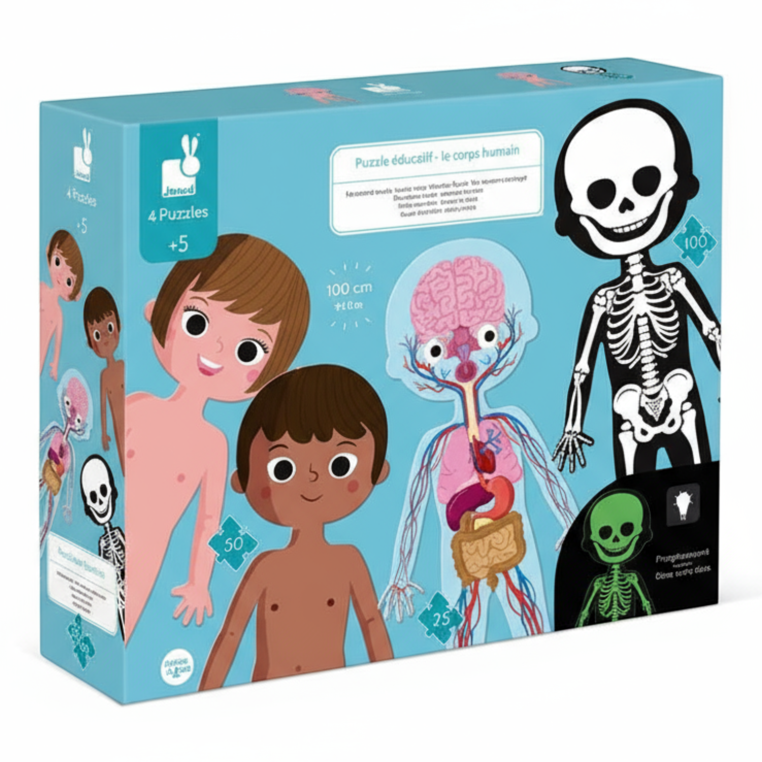 Puzzle mają 1 metr wysokości, aby pomóc dzieciom lepiej zrozumieć ich ciała. W komplecie znajdują się ponadto karty pomocnicze do nauki różnych części ludzkiego ciała, dostępne w 12 językach: francuskim, angielskim, niemieckim, holenderskim, rosyjskim, hiszpańskim, portugalskim, katalońskim, baskijskim, słowackim, czeskim i polskim!