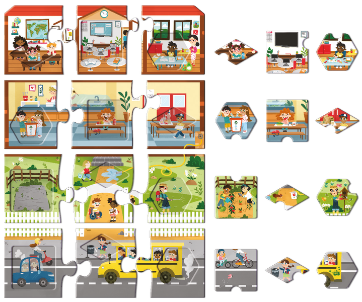 Puzzle ekologiczne z dużymi elementami dla dzieci, które poruszają temat ochrony środowiska. Stworzone w oparciu o zasady Montessori. Obrazują działania, które szkodzą środowisku jak i te, które mają pozytywny wpływ dla Planety.