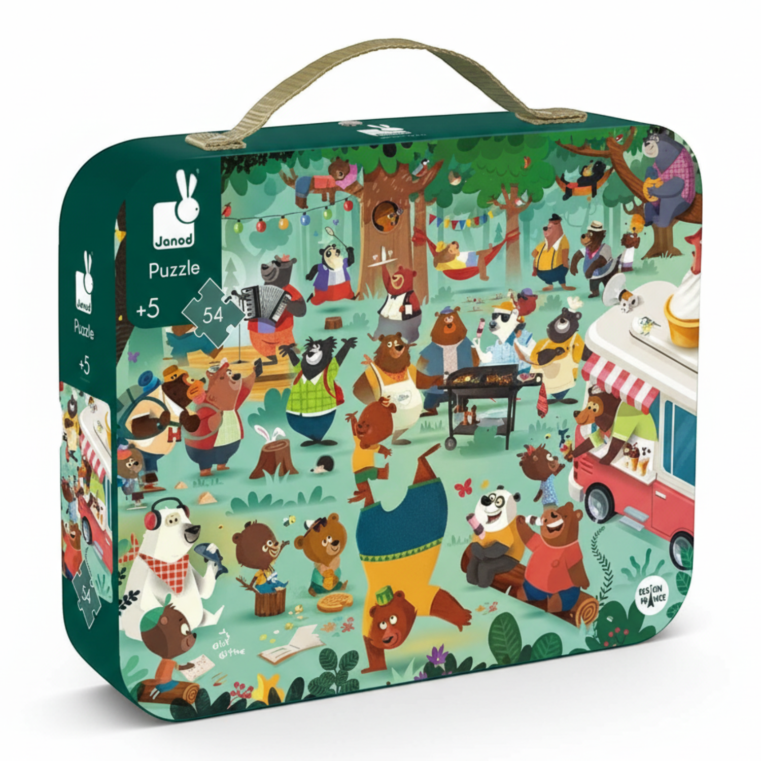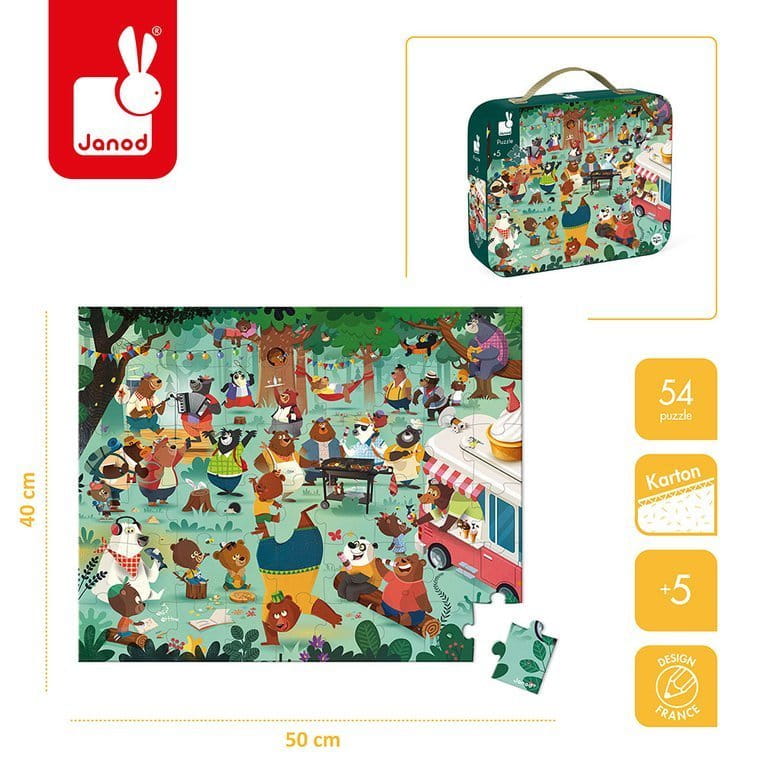 Zestaw puzzli w walizce Rodzina misiów francuskiej marki JANOD składa się z 54 elementów, po ułożeniu tworzących piękny, bogaty w szczegóły obrazek, przedstawiający rodzinny piknik licznej gromady niedźwiedzi. Na leśnej polanie znajdują się m.in. wóz z rybimi lodami, grill, hamaki, rozwieszone między drzewami, misiowa drużyna zuchów oraz ludowa kapela. Gotowy obrazek ma wymiary 40 x 50 cm.