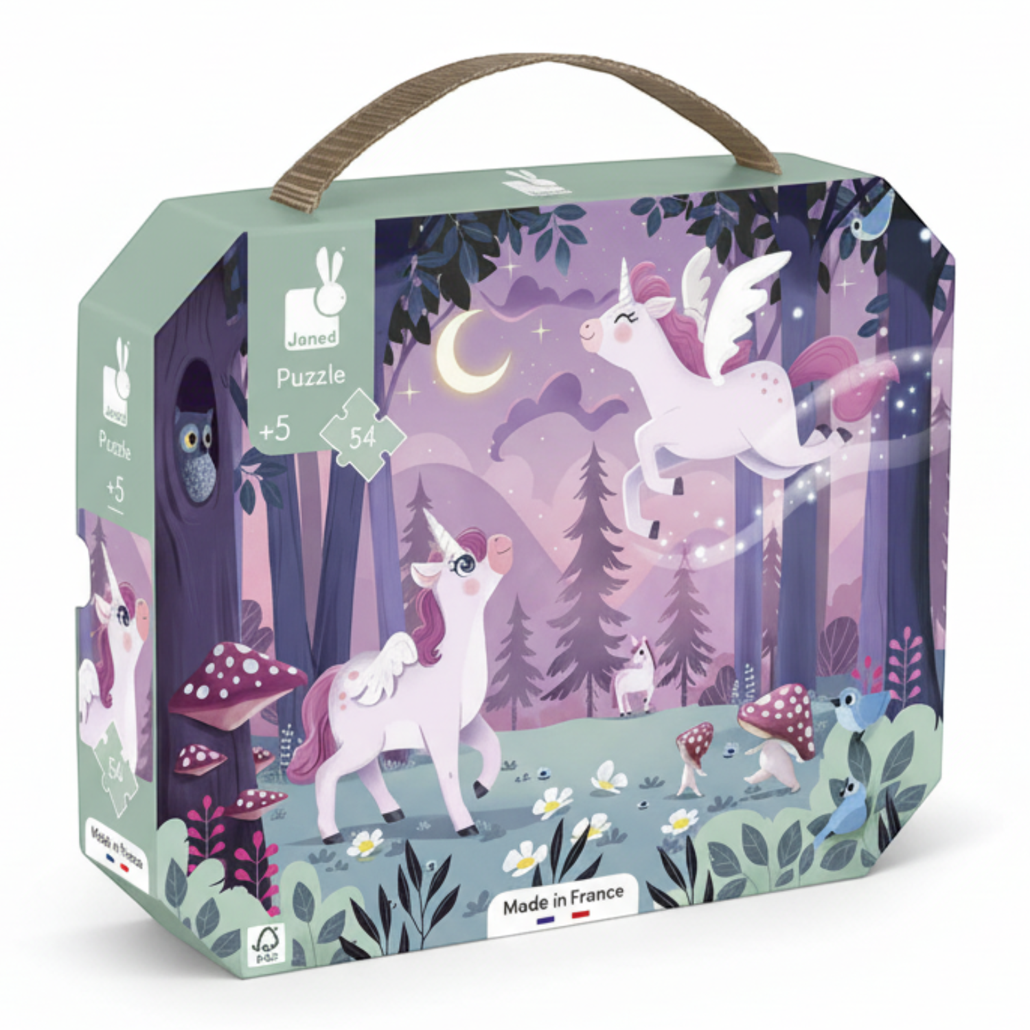 Po ułożeniu tworzą piękny obrazek, przedstawiający jednorożce na nocnej leśnej polanie. Puzzle wykonane są z solidnego kartonu, zaprojektowane i wyprodukowane we Francji. Zapakowane w estetyczną walizeczkę z rączką. Idealnie nadają się na prezent.