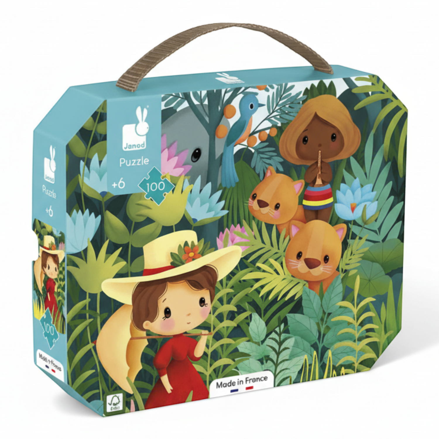 Po ułożeniu tworzą piękną ilustrację, przedstawiającą elegancką podróżniczkę w dżungli. Obraz jest wzorowany na dziełach Henriego Rousseau, naśladując charakterystyczny dla nich styl i inspiracje dziką przyrodą. Puzzle wykonane są z solidnego kartonu, zaprojektowane i wyprodukowane we Francji. Zapakowane w estetyczną walizeczkę z rączką. Idealnie nadają się na prezent.