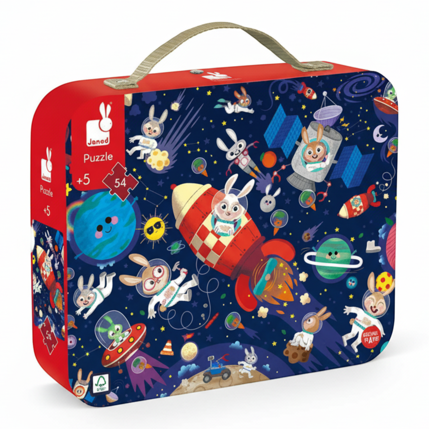 Składa się z 54 elementów, po ułożeniu tworzących piękny, bogaty w szczegóły obrazek, przedstawiający przestrzeń kosmiczną, pełną pojazdów kosmicznych (rakiet, sond i statków UFO) oraz astronautów-królików. Puzzle wykonane są z solidnego kartonu FSC. Zaprojektowane i wyprodukowane we Francji. Zapakowane w estetyczną walizeczkę z rączką. Idealnie nadają się na prezent.