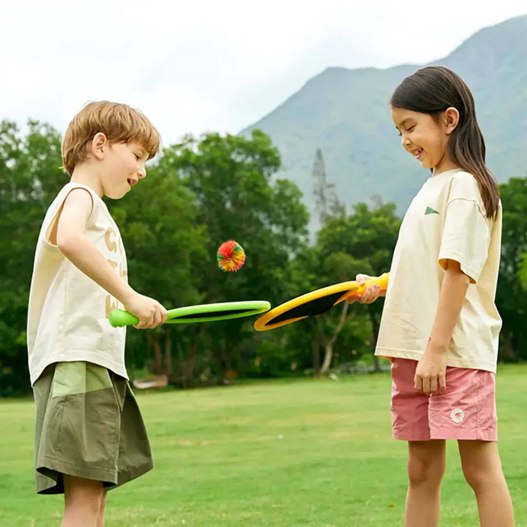 Do zestawu dołączone są dwie różne piłki, które zwiększają wszechstronność zabawy i dostosowanie do umiejętności dziecka. Kolorowa piłka "jeżyk", bardziej masywna, doskonale sprawdzi się do żonglerki i treningu precyzji, pomagając w doskonaleniu umiejętności manualnych. Z kolei miękka, tęczowa piłka, lżejsza i szybsza, jest idealna do dynamicznej gry w parze, rozwijając refleks i koordynację wzrokowo-ruchową w zabawny sposób.