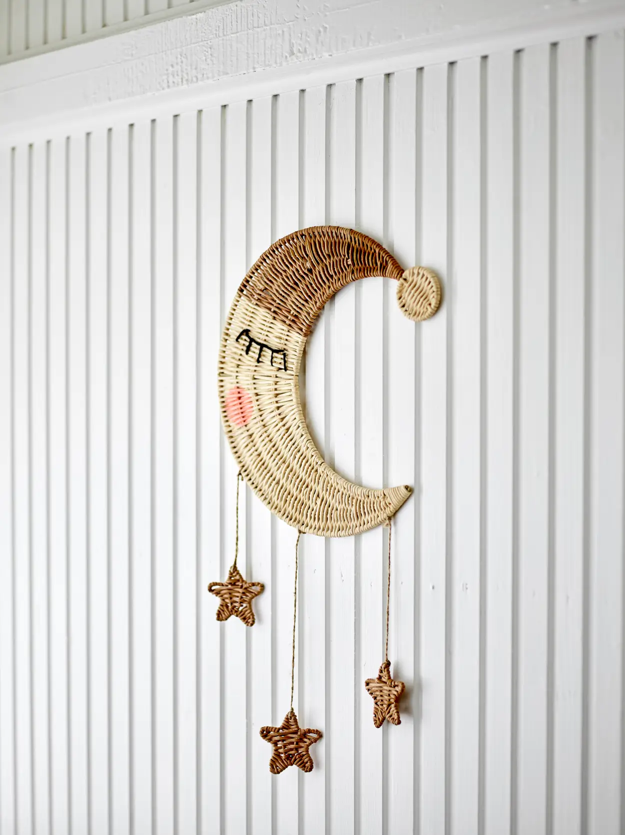 Wykonana z rattanu karuzelka przedstawia księżyc z czapką i gwiazdami, dodając pomieszczeniu ciepłą i przytulną atmosferę. Moony Mobile idealnie pasuje nad łóżkiem, przewijakiem lub jako urocza dekoracja ścienna. Kolor będzie się różnił w zależności od pory roku, w której materiał jest zbierany.