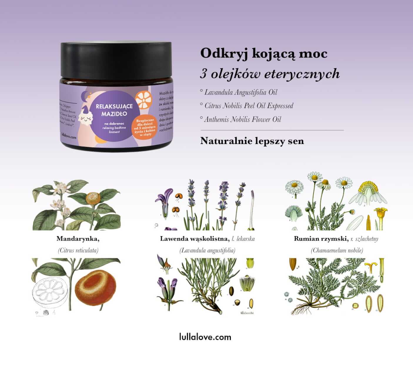 Mazidło do nacierania i masażu skóry z olejkami eterycznymi ze skórki mandarynki, kwiatów lawendy i rumianku