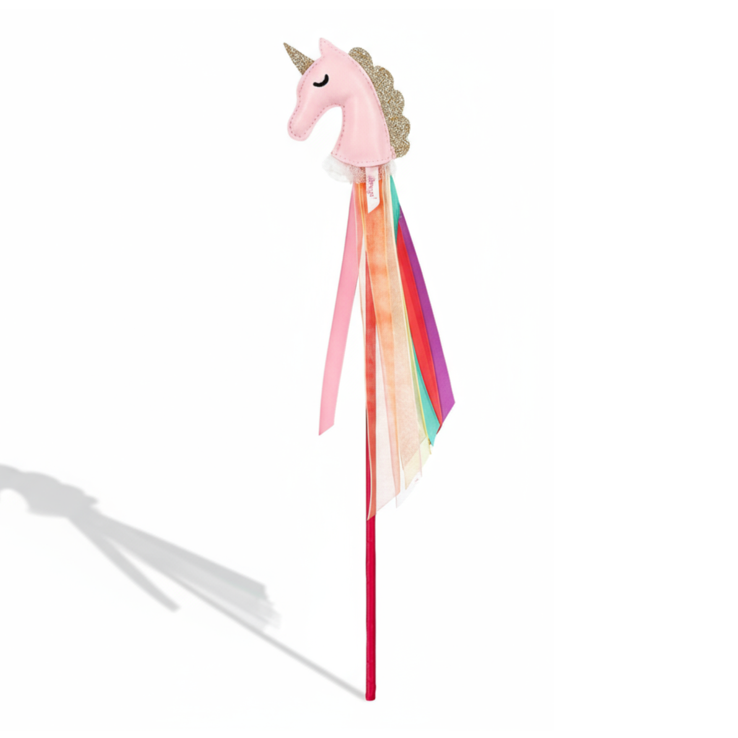 Obciągnięta jest fuksjową satynową wstążką. U góry zdobi ją jasnoróżowa głowa jednorożca, wykonana z ekoskóry, za złotą brokatową grzywą i rogiem oraz kilka wielobarwnych satynowych i tiulowych tasiemek. Ma 37 cm długości, jest poręczna i lekka. Stanowi idealny dodatek do kostiumu wróżki lub księżniczki. Sprawdzi się także jako prezent.