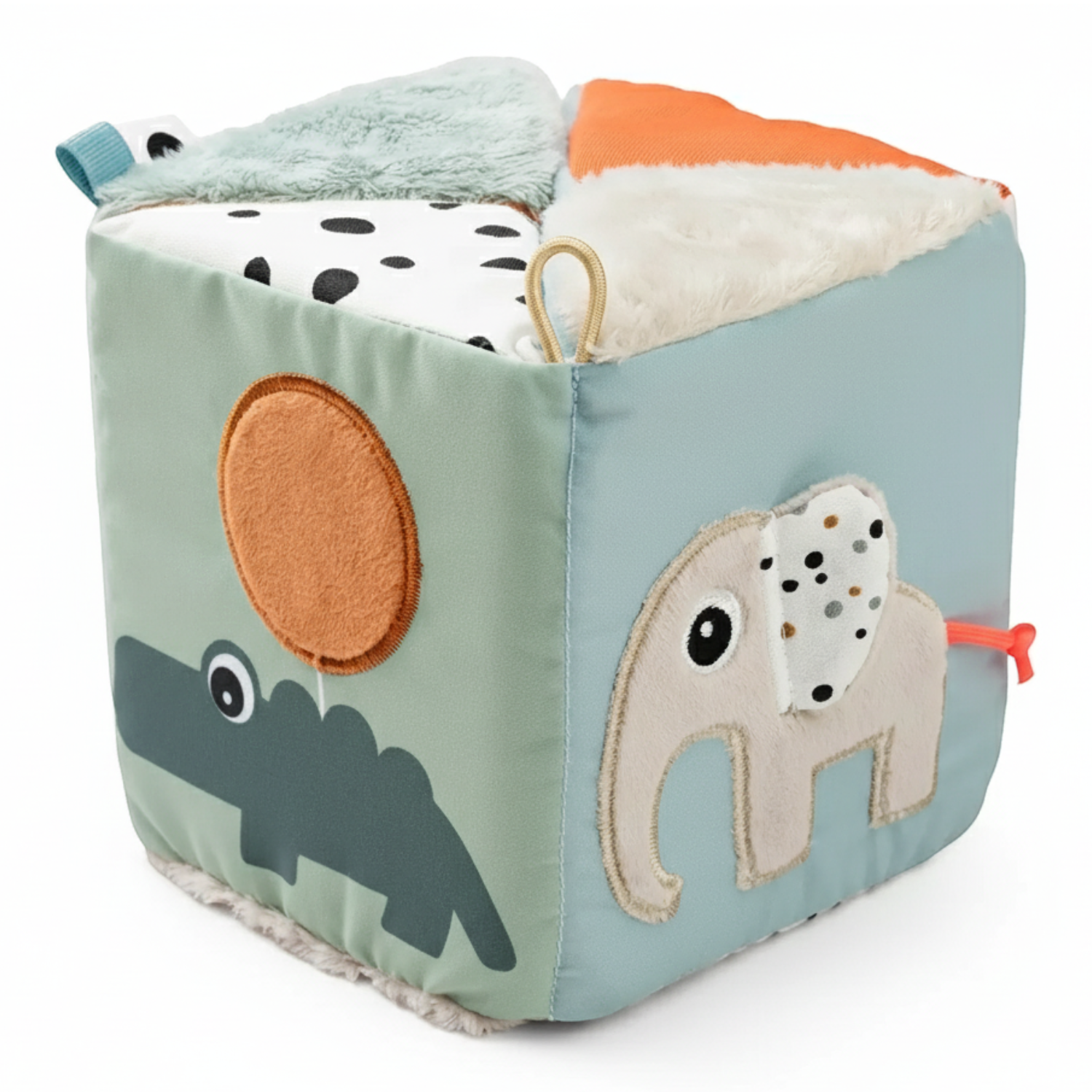 Ta miękka rozkładana kostka sensoryczna to różnorodne tekstury, słodkie zwierzątka, kolorowe oraz kontrastowe nadruki, kształty i metki inspirują do odkrywania. Żywe kolory i kontrasty wzmacniają wizualną stymulację, a szeleszczące elementy rozwijają zmysł słuchu.