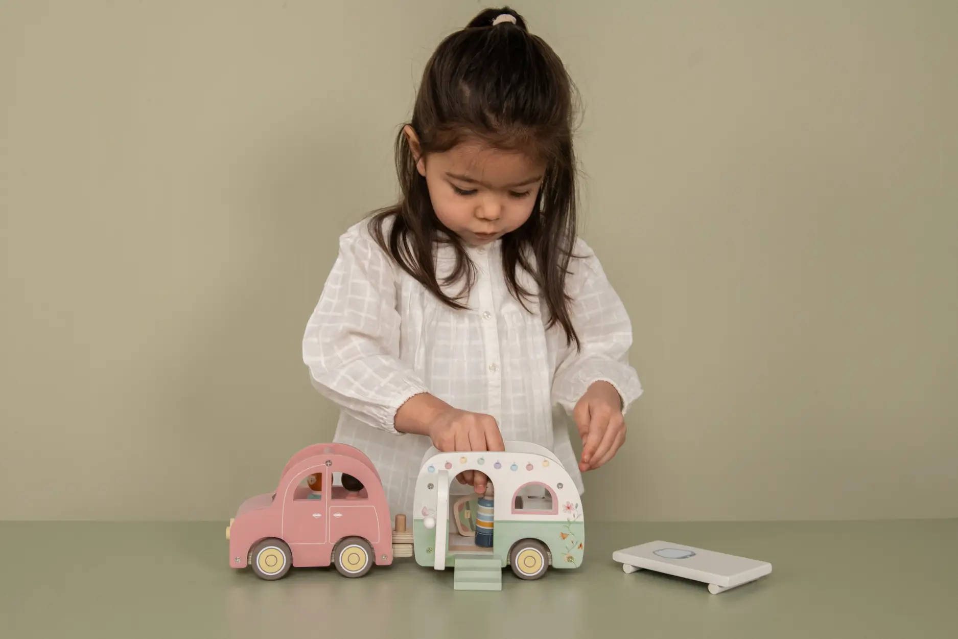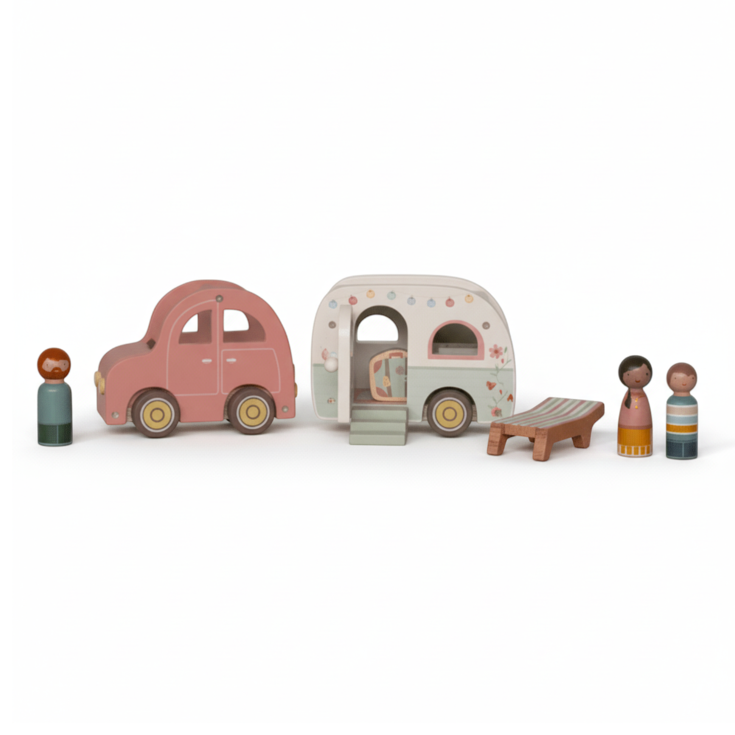 Rozbij obóz gdziekolwiek chcesz i ciesz się swobodą posiadania domu zawsze ze sobą. Niezależnie od tego, czy jesteś w salonie, pokoju dziecięcym czy kuchni, wyjmij krzesło plażowe, rozpakuj i pozwól 3 figurkom cieszyć się otoczeniem. Gładko toczące się koła pozwalają Twojemu maluchowi bez wysiłku poruszać się po podłodze w poszukiwaniu nowych miejsc na nocleg w przyczepie kempingowej. Drzwi i dach przyczepy kempingowej można otwierać, a figurki pasują do domku dla lalek i innych zestawów do zabawy, takich jak samolot i autobus szkolny. Pozwól swojemu maluchowi cieszyć się magią podróży i odkryć, dzięki temu wszechstronnemu drewnianemu zestawowi.