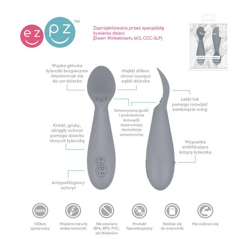 Innowacyjna silikonowa łyżeczka Tiny Spoon została zaprojektowana przez specjalistę w dziedzinie logopedii, dzięki czemu jej kształt jest idealnie dopasowany do ust małego dziecka. Dodatkowo wspiera on rozwój aparatu mowy i małej motoryki. Wąska główka ma optymalną wielkość i jest całkowicie bezpieczna dla delikatnych dziąseł maluszka, miękki materiał chroni wyrzynające się ząbki, a lekkie wygięcie pomaga w nauce domykania warg. Cztery silikonowe wypustki na krawędzi wewnętrznej, stymulujące sensorycznie usta i dziąsła/ząbki dziecka, zapobiegają dławieniu się. Odpowiednio krótki, dość gruby, zaokrąglony i antypoślizgowy uchwyt łyżeczki został wyprofilowany tak, by była ona łatwa do trzymania w małych rączkach. Dodatkowa wypustka pod spodem uchwytu stabilizuje leżącą łyżeczkę.
