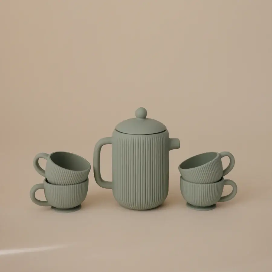 Ta przeurocza zabawka składa się z dzbanka ze zdejmowaną pokrywką i trzech pasujących filiżanki do herbaty. Wszystkie wykonane w całości z najwyższej jakości silikonu spożywczego. Miękki i trwały zestaw do herbaty jest idealny do wielogodzinnej zabawy i zachęca do rozwoju komunikacji i umiejętności społecznych.