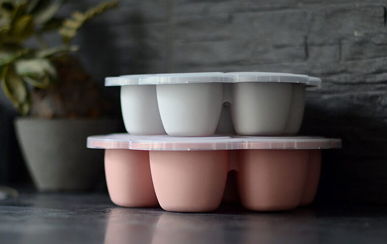 Wykonany jest z najwyższej jakości silikonu, wolnego od BPA, o wysokiej odporności na tarcie. Jest stabilny i zachowuje kształt przy przenoszeniu, a jednocześnie jest na tyle miękki, że łatwo obrócić poszczególne pojemniki, by wyjąć z nich porcje. Hermetyczna pokrywka pozwala zachować smak i aromat jedzenia.