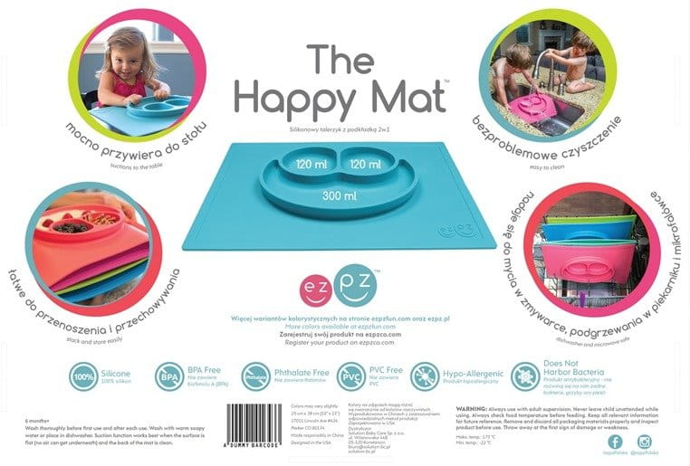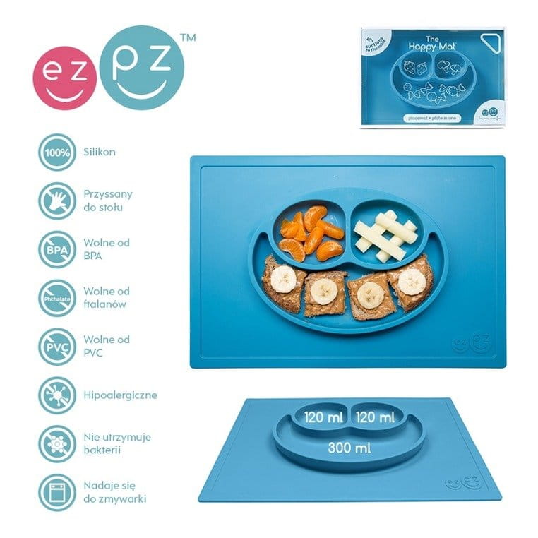 Innowacyjna silikonowa podkładka mocno przywiera do stołu czy innej gładkiej powierzchni, na której ją położysz, dzięki czemu małe dziecko nie będzie w stanie jej przesunąć czy zrzucić. Trójdzielny talerz pozwala podzielić posiłek na porcje, co ułatwi malcowi naukę samodzielnego jedzenia, a z czasem także – rozpoznawanie kategorii pokarmów. Dodatkowo, zaprojektowany podział ułatwi rodzicowi podanie posiłku złożonego z odpowiedniej ilości warzyw i innych ważnych składników żywieniowych. Radosny wygląd – dwie mniejsze przegródki przypominają kształtem oczy, a większa uśmiech – sprawia, że domowe posiłki będę maluchom pozytywnie się kojarzyć. Nadaje się do serwowania zarówno zimnych, jak i ciepłych potraw. To pierwszy i wciąż flagowy projekt marki EZPZ, której motto brzmi: „mniej bałaganu, więcej frajdy”.