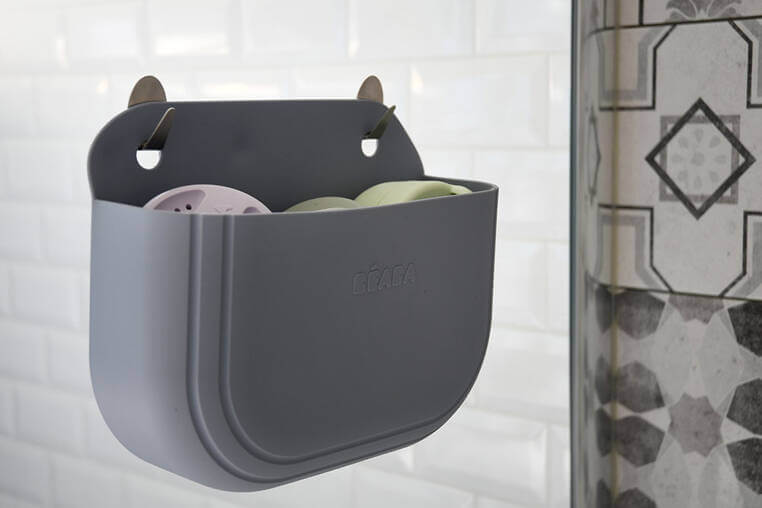 Poręczne dla małych rączek zabawki różnią się od siebie rozmiarem oraz wielkością i rozmieszczeniem otworów, przez które można przelewać wodę. Zostały zaprojektowane z myślą o rozwoju małej motoryki i odkrywaniu przez maluszka nowych wrażeń. Kosz do ich przechowywania posiada dwie przegródki, które ułatwiają organizację oraz otwory na dnie, zapewniające szybkie odprowadzanie wody. Można go zawiesić na haczykach (posiada odpowiednie otwory) lub przyczepić do ściany za pomocą przyssawek.