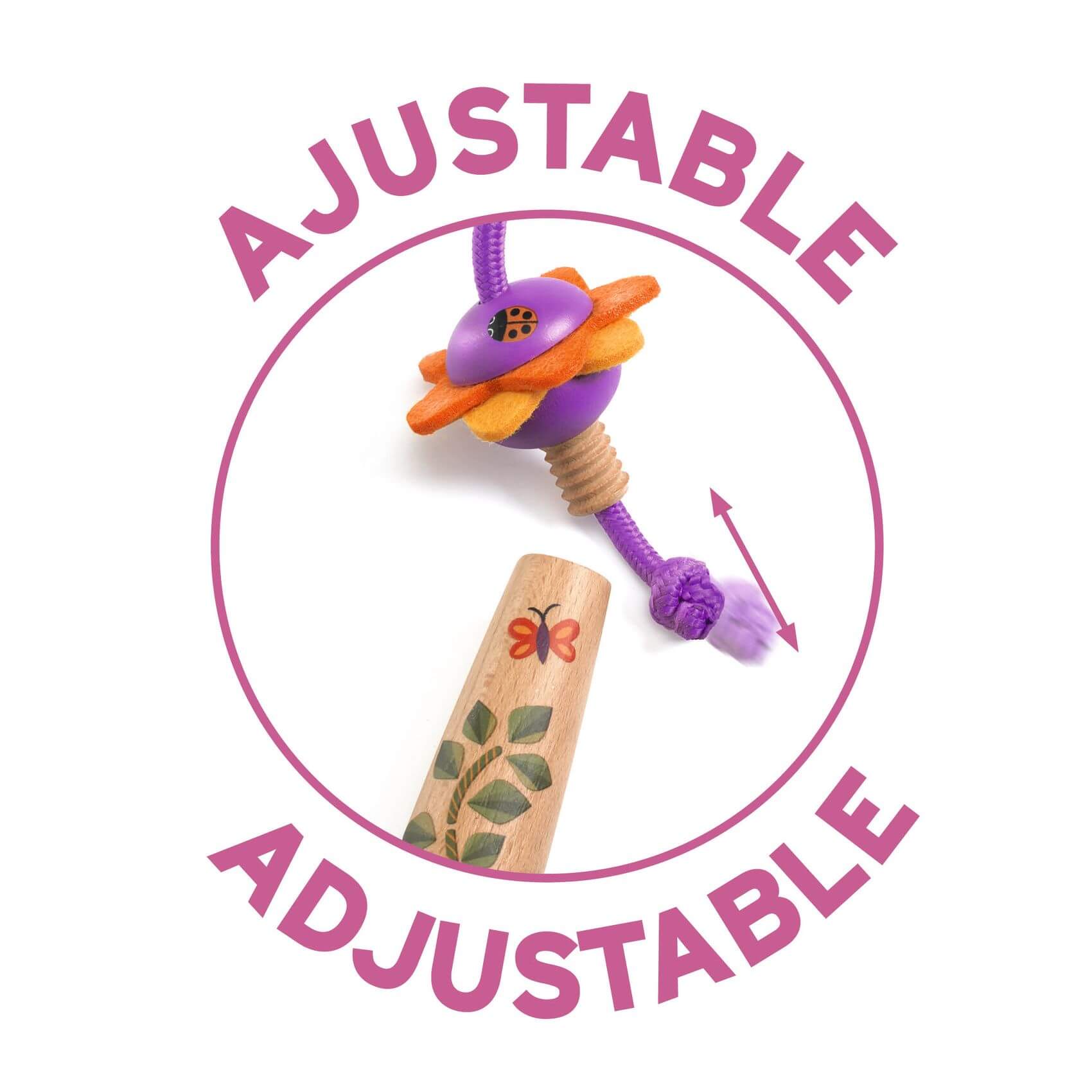 Fioletowy sznurek można regulować do wzrostu dziecka, wystarczy odkręcić główkę i skrócić sznurek, zawiązując supełek. Rączki są zakończone filcowymi elementami w kształcie kwiatka. Wykonane są z drewna posiadającego certyfikat FSC®.