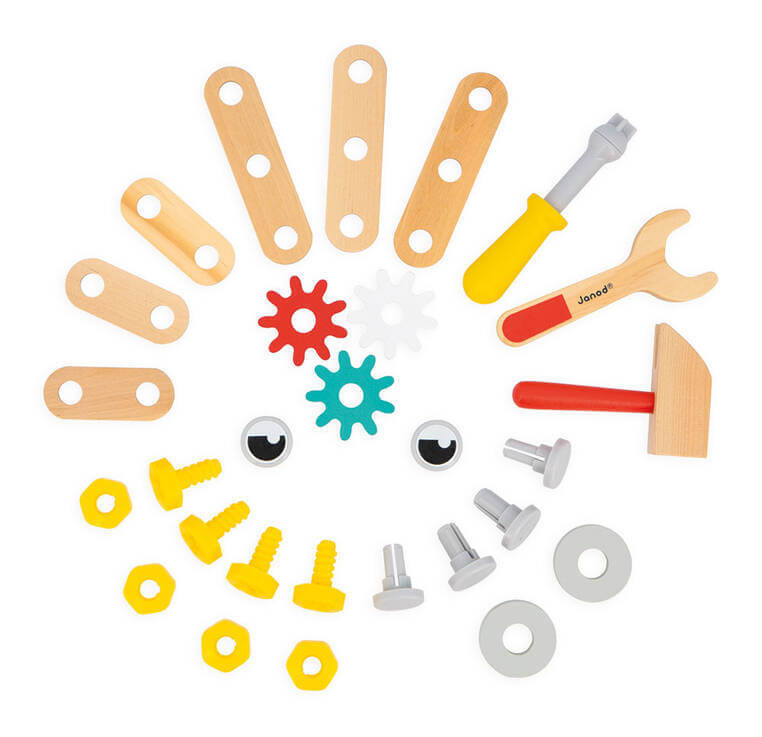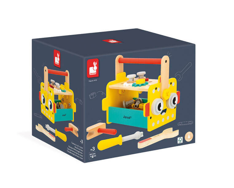 Zestaw składa się z poręcznej skrzynki z uchwytem na narzędzia, ozdobionej oczami i uśmiechem robota oraz kompletu śrubek, nakrętek, podkładek oraz kół zębatych, młotka, klucza i śrubokręta. Zabawka wspomaga rozwój dziecka na wielu płaszczyznach: rozwija zdolności manualne, precyzję ruchów, cierpliwość, koncentrację, stymuluje wyobraźnię i zachęca do tworzenia historii oraz odgrywania sytuacji, znanych z obserwacji dorosłych.