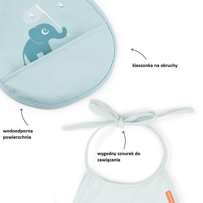 Dzięki wodoodpornej powierzchni zapewniają doskonałą ochronę ubrań Twojego dziecka i są łatwe do wyczyszczenia po posiłku. Wbudowana kieszeń jest idealna do łapania jedzenia, które spadło, pomagając zminimalizować bałagan podczas posiłków.