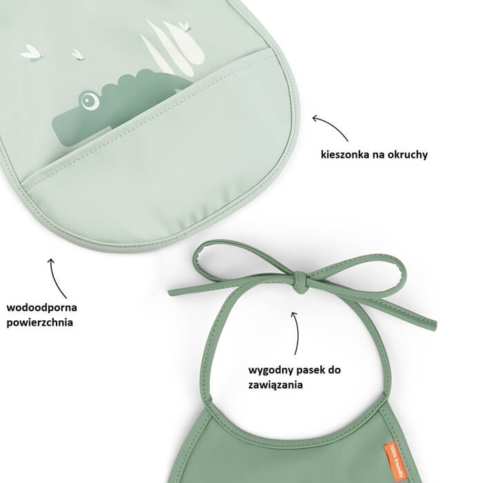 Dzięki wodoodpornej powierzchni zapewniają doskonałą ochronę ubrań Twojego dziecka i są łatwe do wyczyszczenia po posiłku. Wbudowana kieszeń jest idealna do łapania jedzenia, które spadło, pomagając zminimalizować bałagan podczas posiłków.