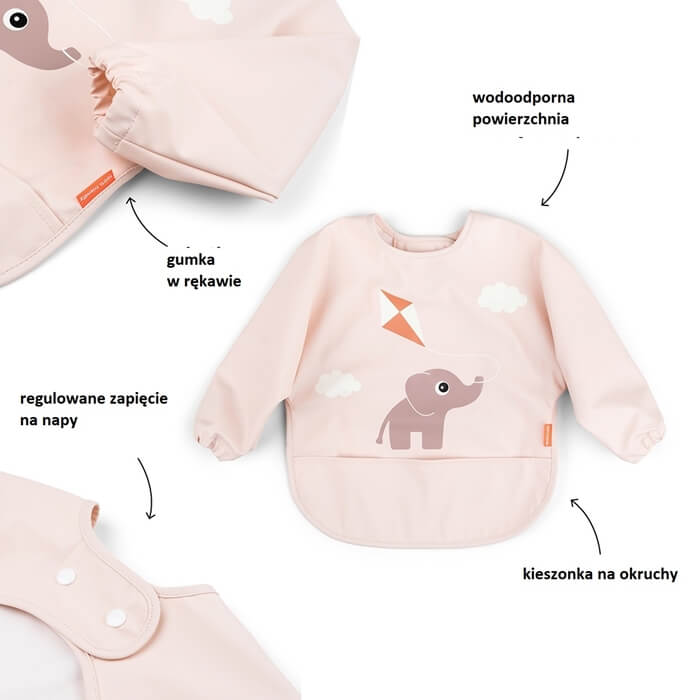 Wygodne uzupelnienie całej wyprawki dla malucha z kategorii "rozszerzamy dietę". Śliniaczek zapewnia czystość dzięki wodoodpornej powierzchni, chroniąc ubrania przed rozlaniem i bałaganem. Długie rękawy zakończone gumką stanowią dodatkową ochronę przed zabrudzeniem.