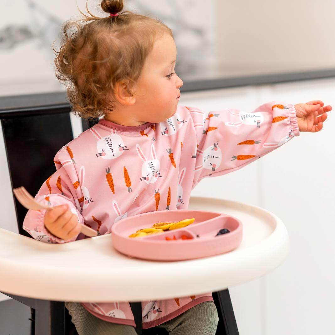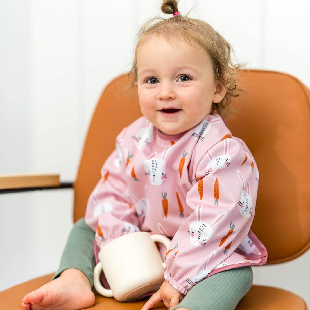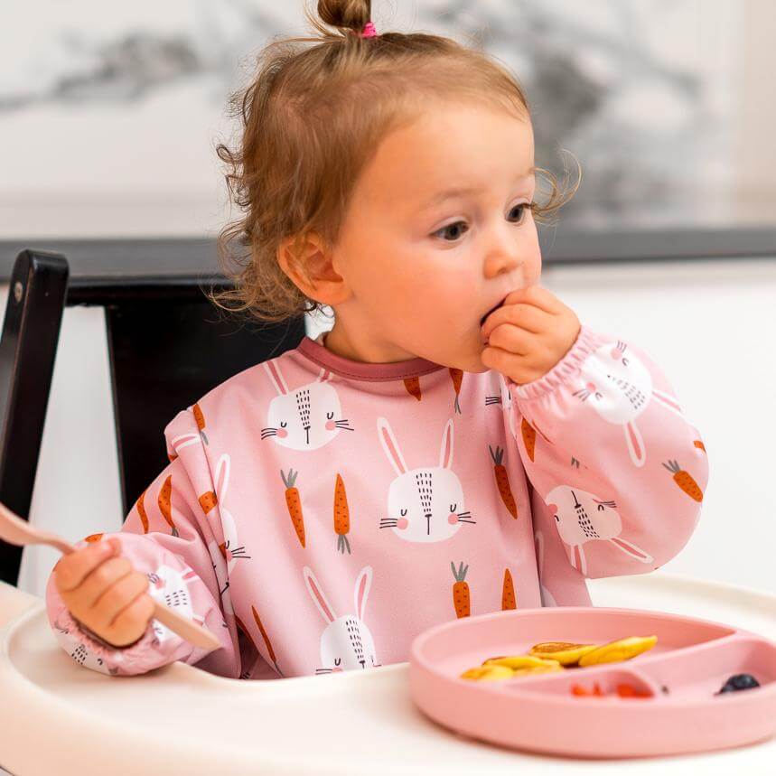 Praktyczny wodoodporny śliniak z rękawami oraz kieszonką, który wychwytuje spadające jedzenie oraz płyny