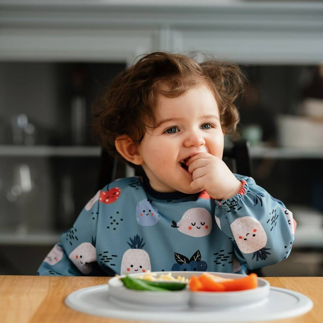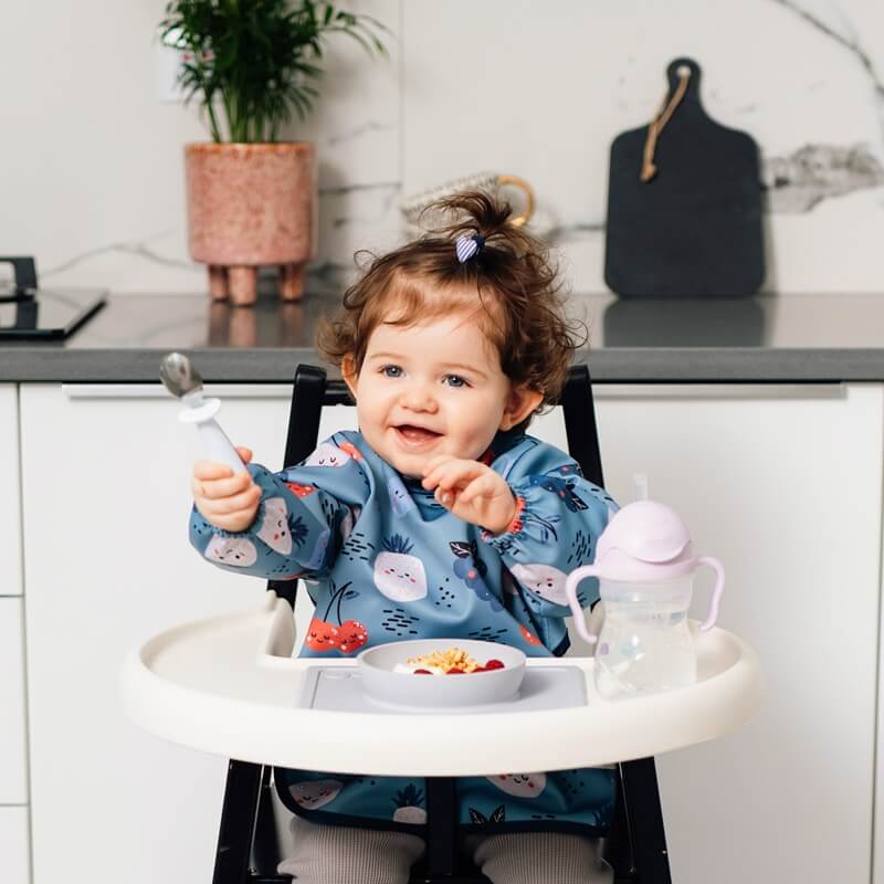 Praktyczny wodoodporny śliniak z rękawami oraz kieszonką, która wychwytuje spadające jedzenie oraz płyny