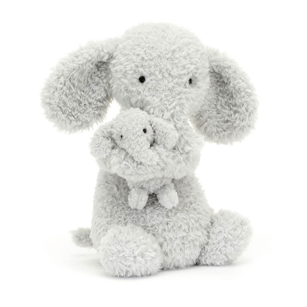 Słoń tulący maleństwo marki Jellycat to bardzo mięciutka i przyjemna w dotyku przytulanka w pięknym szarym kolorze