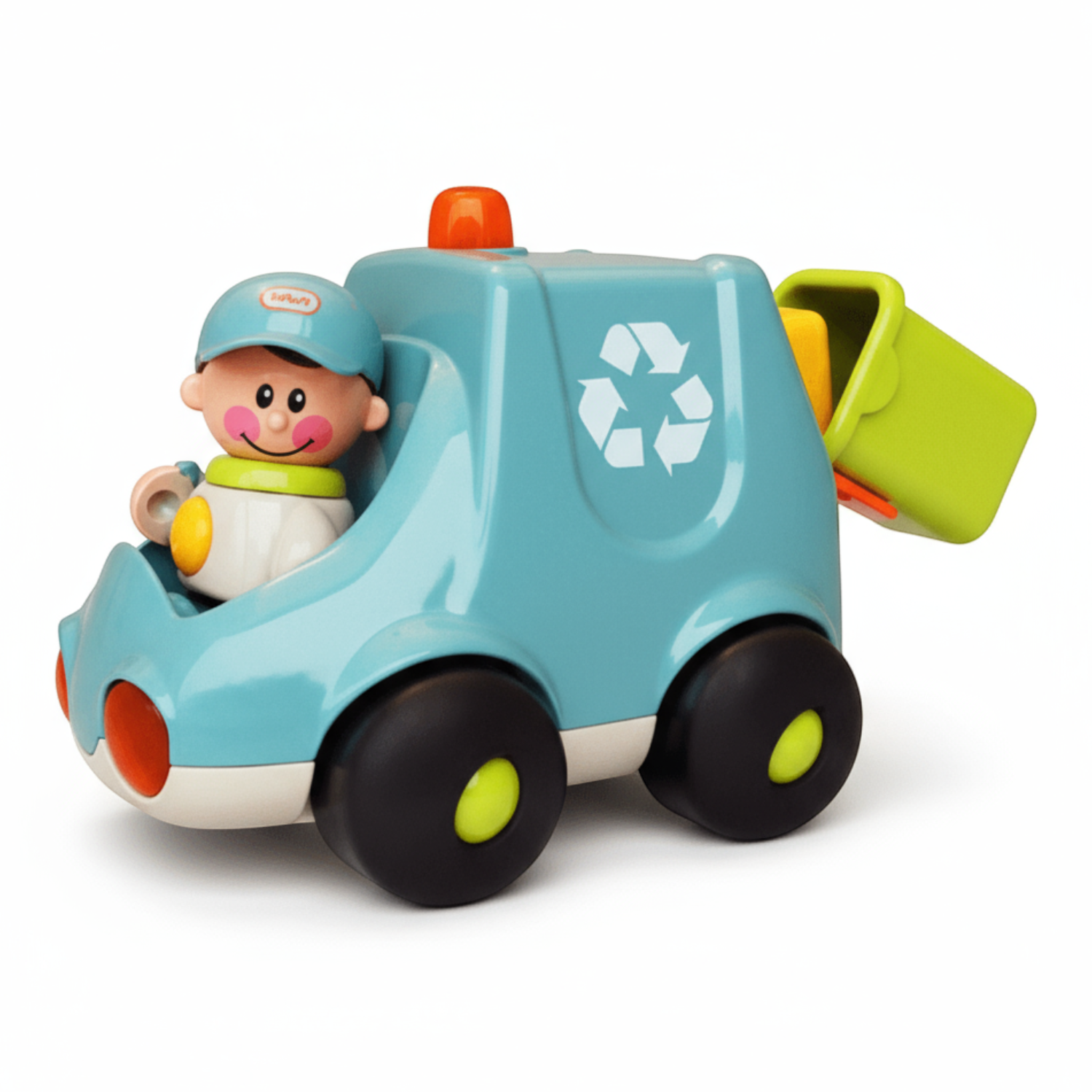 - Rozwój motoryki: Manipulowanie ruchomymi elementami śmieciarki wspiera rozwój motoryki małej i dużej, a także poprawia koordynację ręka-oko. Dzieci uczą się precyzyjnych ruchów i kontroli nad zabawką. Kierowca to ludzik z ruchomymi rączkami, nożkami i obracaną główką. Czapkę można przesuwać na głowie, aby uzyskać inny wygląd! Ludzik ma piszczący brzuszek, porusza się w różnych pozach, jest bezpieczny podczas ząbkowania. Możliwość kolekcjonowania.