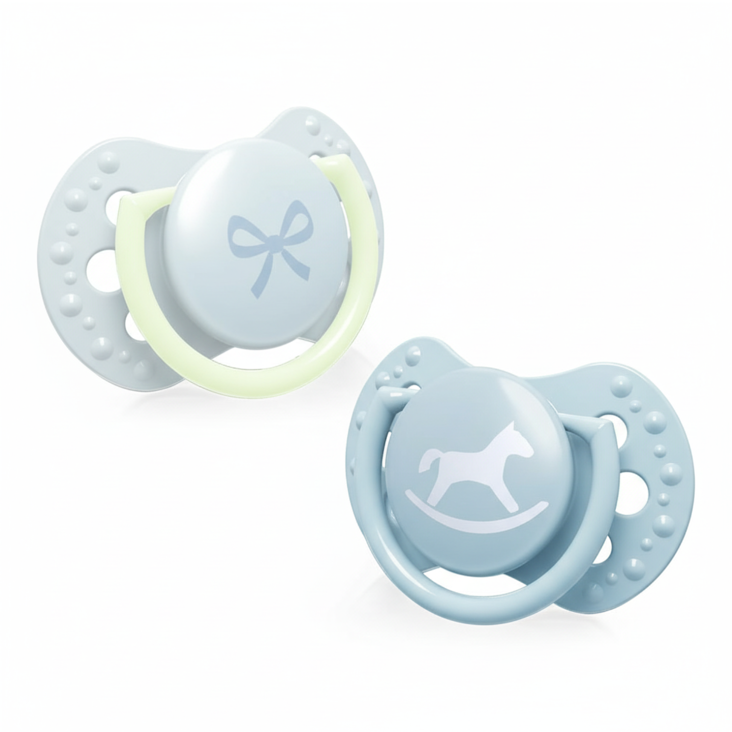 Aby osiągnąć ten efekt wykonaliśmy ją z niejednorodnej warstwy silikonu. Oczywiście używamy silikonu najwyższej jakości. Jest to materiał bezpieczny i trwały oraz nieposiadający smaku i zapachu. Uchwyt jednego ze smoczków w zestawie świeci w ciemności, więc łatwo odnaleźć go w nocy, co na pewno pomoże rodzicom noworodka.