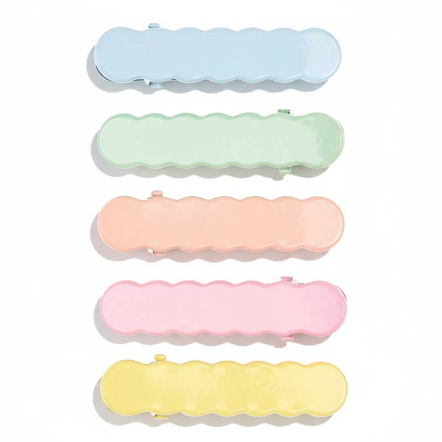 Spinki mają wydłużony falowany kształt i pastelowe kolory: błękitny, miętowy, brzoskwiniowy, różowy i żółty. Ząbkowane zaciski sprawiają, że ozdoby stabilnie trzymają się włosów. Idealne zarówno na przyjęcia, jak i na co dzień. Nadaje się także na prezent.